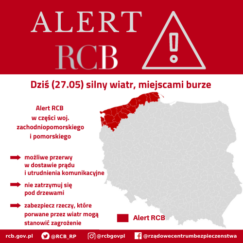 Uwaga! Dziś (27.05) silny wiatr, miejscami burze. Możliwe przerwy w dostawie prądu. Zabezpiecz rzeczy, które może porwać wiatr. Alert RCB został wysłany do cześć powiatów w województwie zachodniopomorskim i pomorskim.