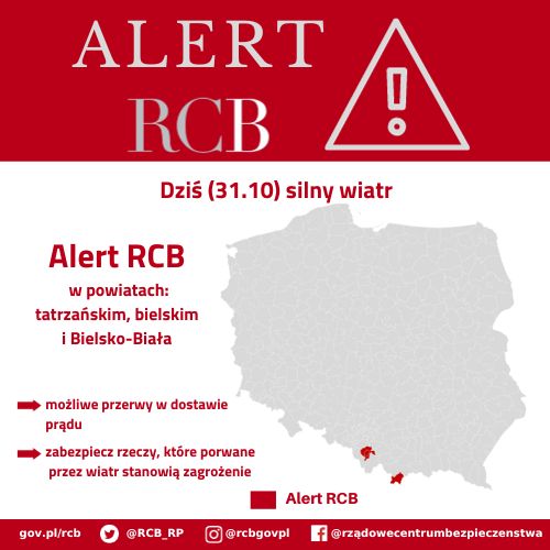 „Uwaga! Dziś (31.10) silny wiatr. Możliwe przerwy w dostawie prądu. Zabezpiecz rzeczy, które może porwać wiatr”. Alert RCB o takiej treści został wysłany do odbiorców na terenie powiatów: tatrzańskiego (województwo małopolskie), bielskiego i Bielsko-Biała (województwo śląskie). IMGW wydał ostrzeżenia 2. stopnia dla tego obszaru.