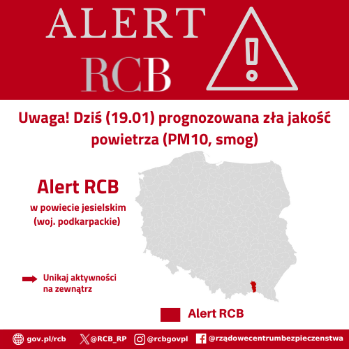 "Uwaga! Dziś (19.01) prognozowana jest zła jakość powietrza w zakresie pyłu zawieszonego PM10 (smog). Unikaj aktywności na zewnątrz".