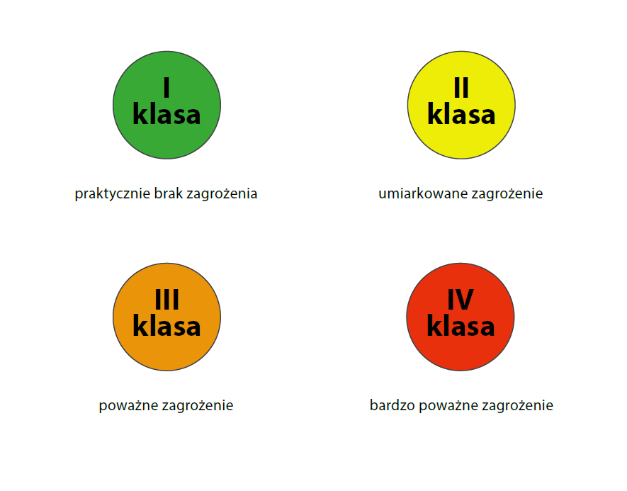 Według przedstawionych powyżej kryteriów zagrożenia biologiczne dzieli się na cztery klasy: