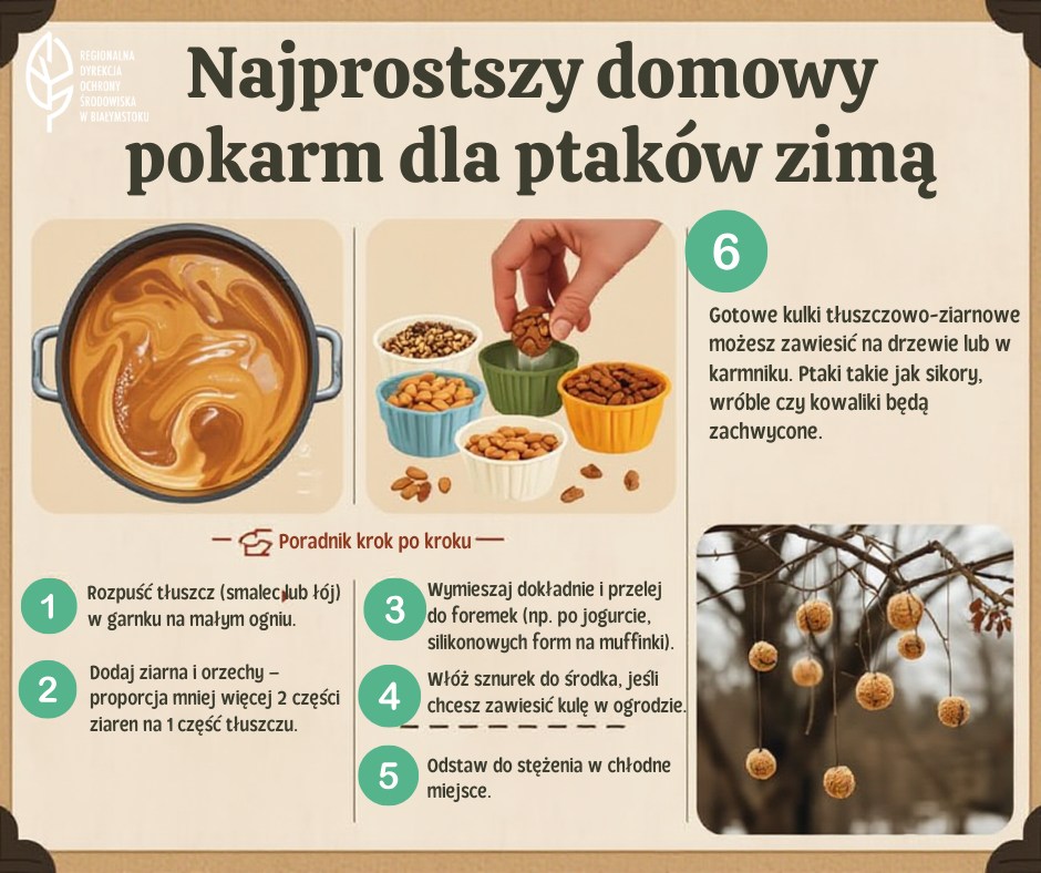 Zimą ptakom trudniej znaleźć pożywienie, dlatego możemy pomóc im w prosty i bezpieczny sposób - przygotowując domowy pokarm z ziaren, orzechów i tłuszczu. Pamiętajmy jednak, aby nie używać chleba, resztek kuchennych ani produktów solonych, ponieważ mogą ptakom zaszkodzić.