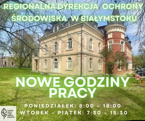 Szanowni Państwo, uprzejmie informujemy, że Regionalna Dyrekcja Ochrony Środowiska w Białymstoku wprowadziła nowe godziny pracy