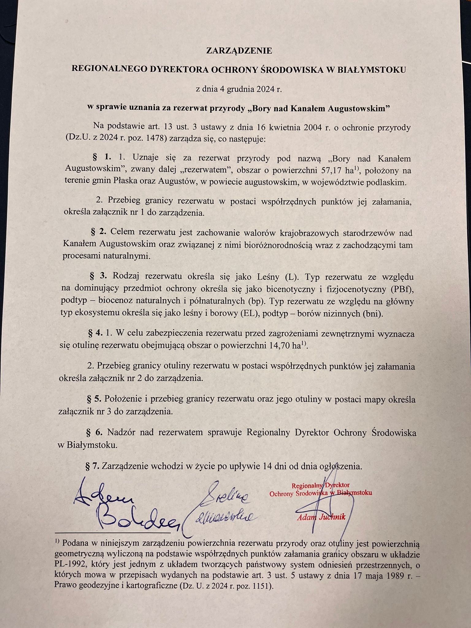 4 grudnia 2024 r. Regionalny Dyrektor Ochrony Środowiska w Białymstoku Adam Juchnik podpisał zarządzenia w sprawie powołania 6 nowych rezerwatów przyrody w województwie podlaskim, w Puszczach Augustowskiej i Knyszyńskiej: