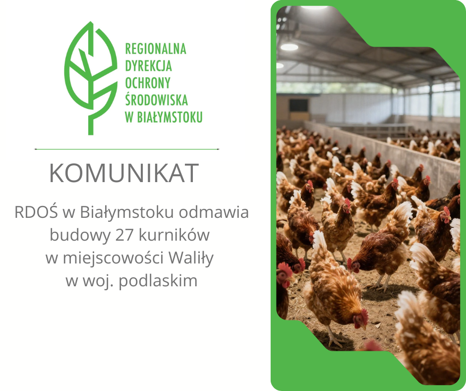 Regionalna Dyrekcja Ochrony Środowiska w Białymstoku, po przeanalizowaniu wpływu planowanej budowy fermy drobiu składającej się z 27 kurników w miejscowości Waliły na środowisko, odmówiła realizacji inwestycji