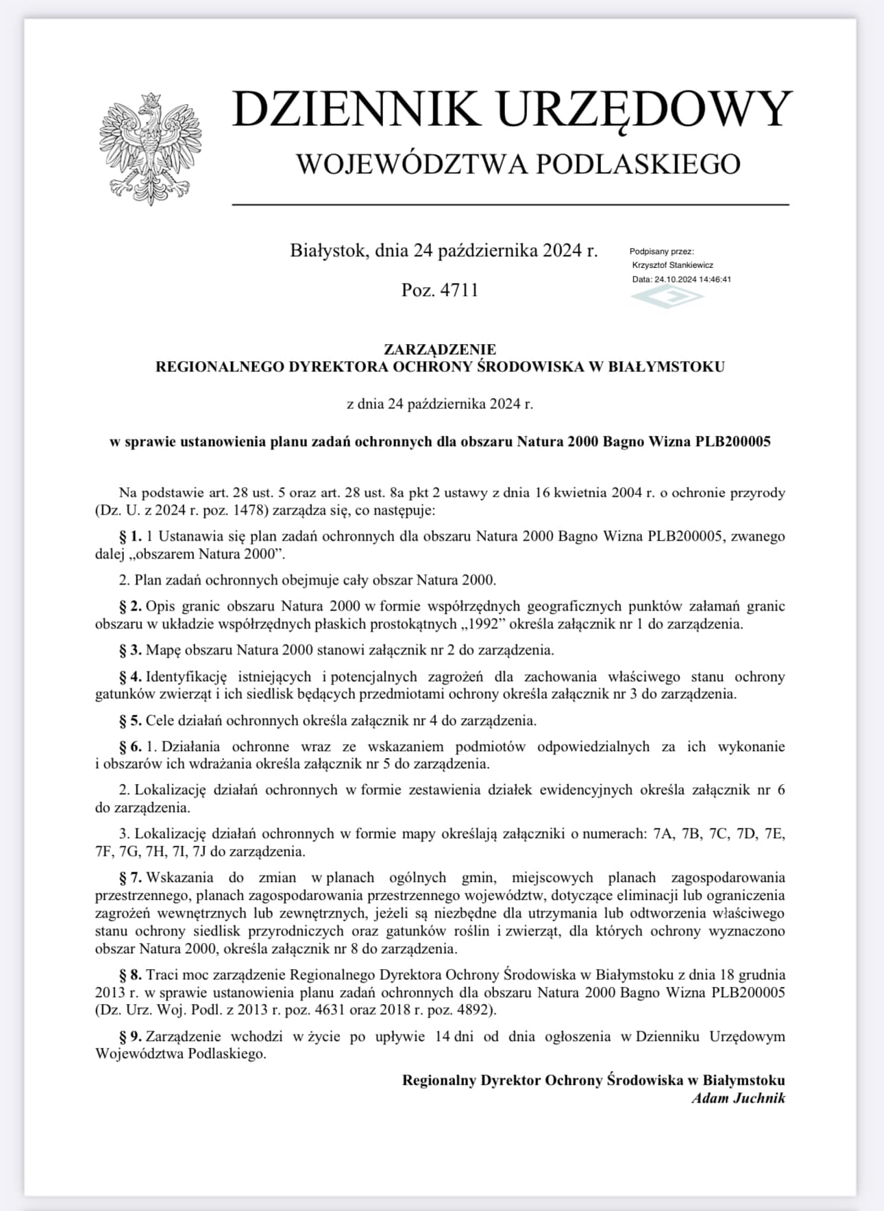 Wiceminister Mikołaj Dorożała w czasie konferencji prasowej podziękował Dyrektorowi Adamowi Juchnikowi i całemu zespołowi Regionalna Dyrekcja Ochrony Środowiska w Białymstoku za przygotowanie planu zadań ochronnych dla terenów Bagno Wizna, który obejmuje 10.000 ha łąk na torfowiskach. To pierwszy w Polsce tego typu plan zadań ochronnych, który godzi interesy rolników i ochrony przyrody, a przede wszystkim utrzymuje retencję wody na torfowych łąkach, chroniąc siedliska rzadkich ptaków.