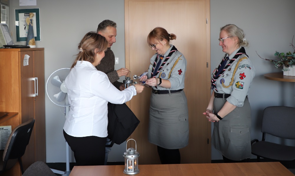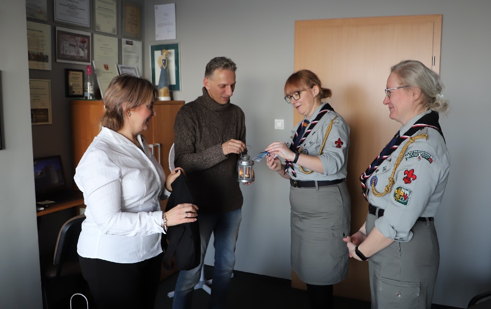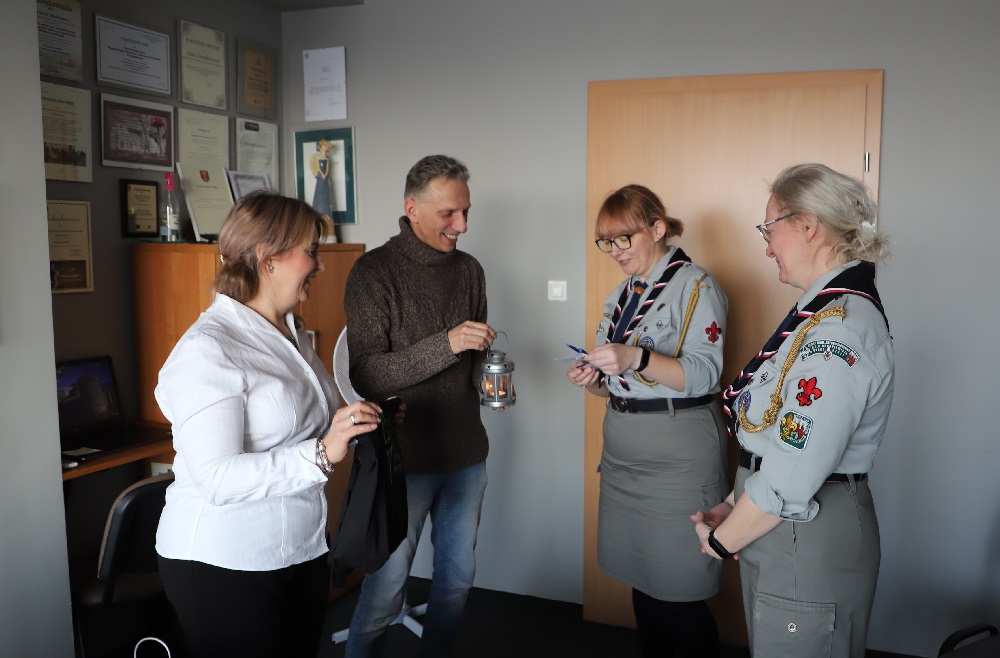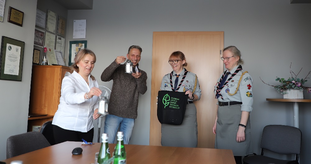14 grudnia Harcerze ze wspólnoty Związku Harcerstwa Polskiego, Chorągwi Kujawsko-Pomorskiej ZHP gościli w Regionalnej Dyrekcji Ochrony Środowiska w Bydgoszczy. Podczas krótkiej uroczystości Betlejemskie Światło Pokoju zostało przekazane na ręce Pana Sebastiana Dąbrowskiego (p.o. Zastępca Regionalnego Dyrektora Ochrony Środowiska w Bydgoszczy, p.o. Regionalny Konserwator Przyrody w Bydgoszczy) oraz Pani Gabrieli Barwińskiej-Szczutkowskiej) Naczelnik Wydziału Organizacyjno-Administracyjnego). Spotkanie było okazją do podsumowania współpracy w mijającym roku, złożenia świątecznych życzeń i przekazania upominków.
