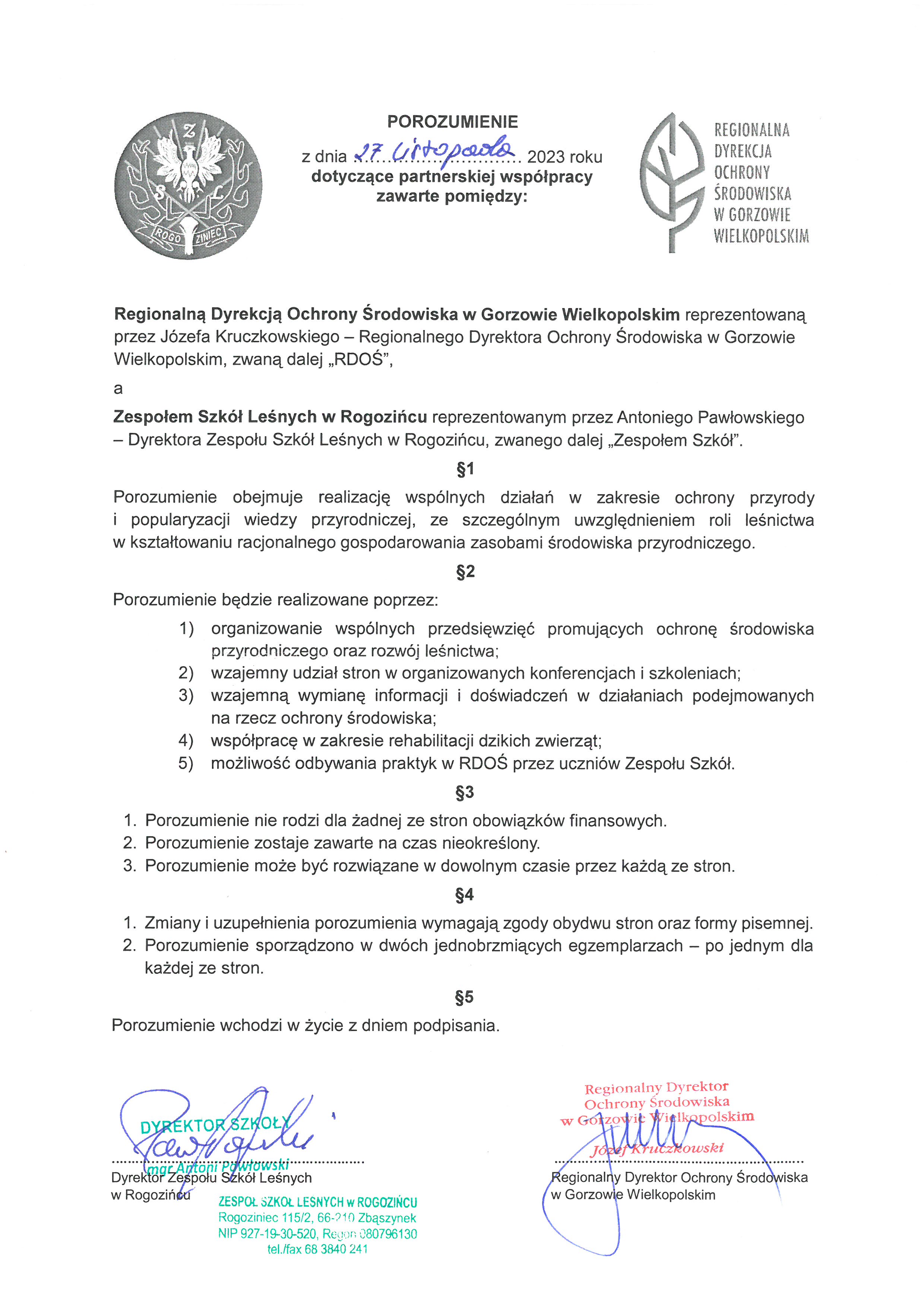 Pod koniec listopada Regionalna Dyrekcja Ochrony Środowiska w Gorzowie Wielkopolskim podpisała porozumienie z Zespołem Szkół Leśnych w Rogozińcu. To już druga z leśnych szkół w województwie lubuskim, po Technikum Leśnym im. prof. Jana Miklaszewskiego w Starościnie, z którym RDOŚ nawiązuje współpracę.