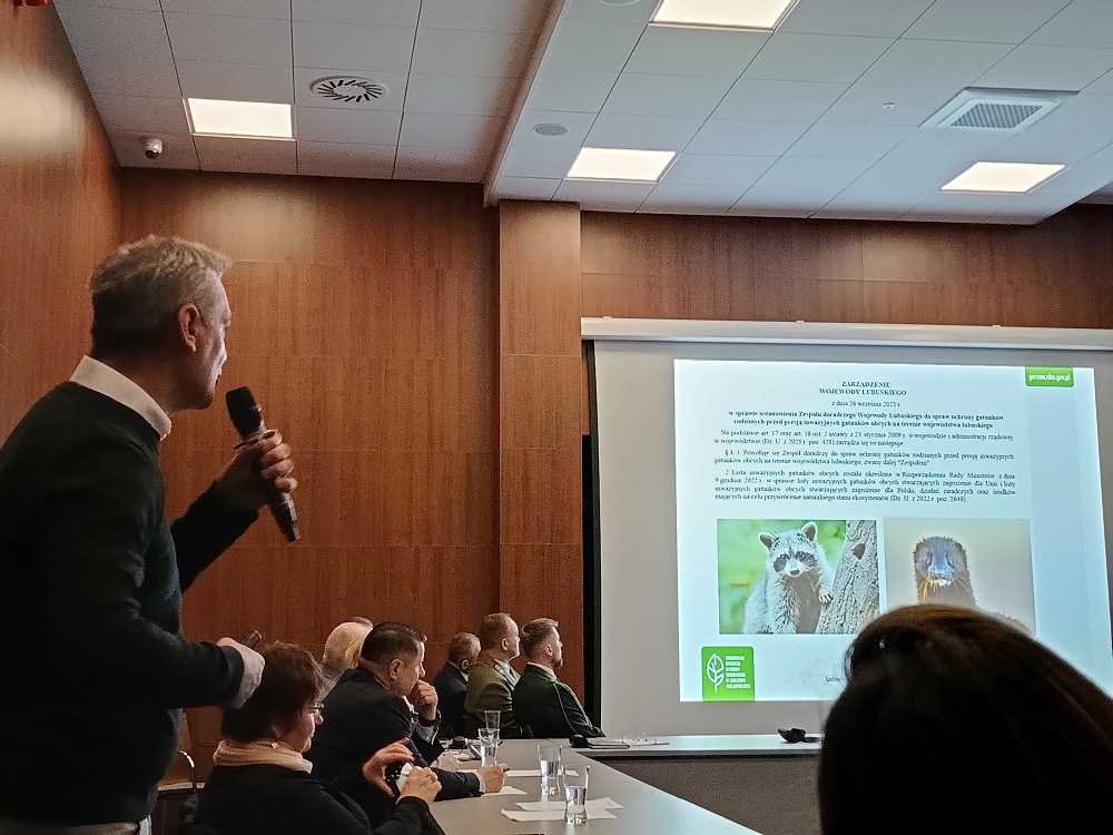 Spotkanie prowadził Remigiusz Wojtera - dyrektor Parku Narodowego „Ujście Warty”. Po powitaniu Wojewody Lubuskiego i pozostałych uczestników, głos zabrał Marek Cebula - Wojewoda Lubuski, wprowadzając zabranych gości w temat zagadnień związanych z IGO. W kolejnym wystąpieniu Michał Bielewicz - Regionalny Konserwator Przyrody w Gorzowie Wielkopolskim przedstawił zagadnienie inwazyjnych gatunków obcych (IGO), ze szczególnym uwzględnieniem obowiązujących procedur administracyjnych, a także zaprezentował działania podzespołu, któremu przewodniczy w zakresie przygotowywanej strategii dla woj. lubuskiego dotyczącej ochrony cennych obszarów przyrodniczych przed presją szopa pracza i norki amerykańskiej.