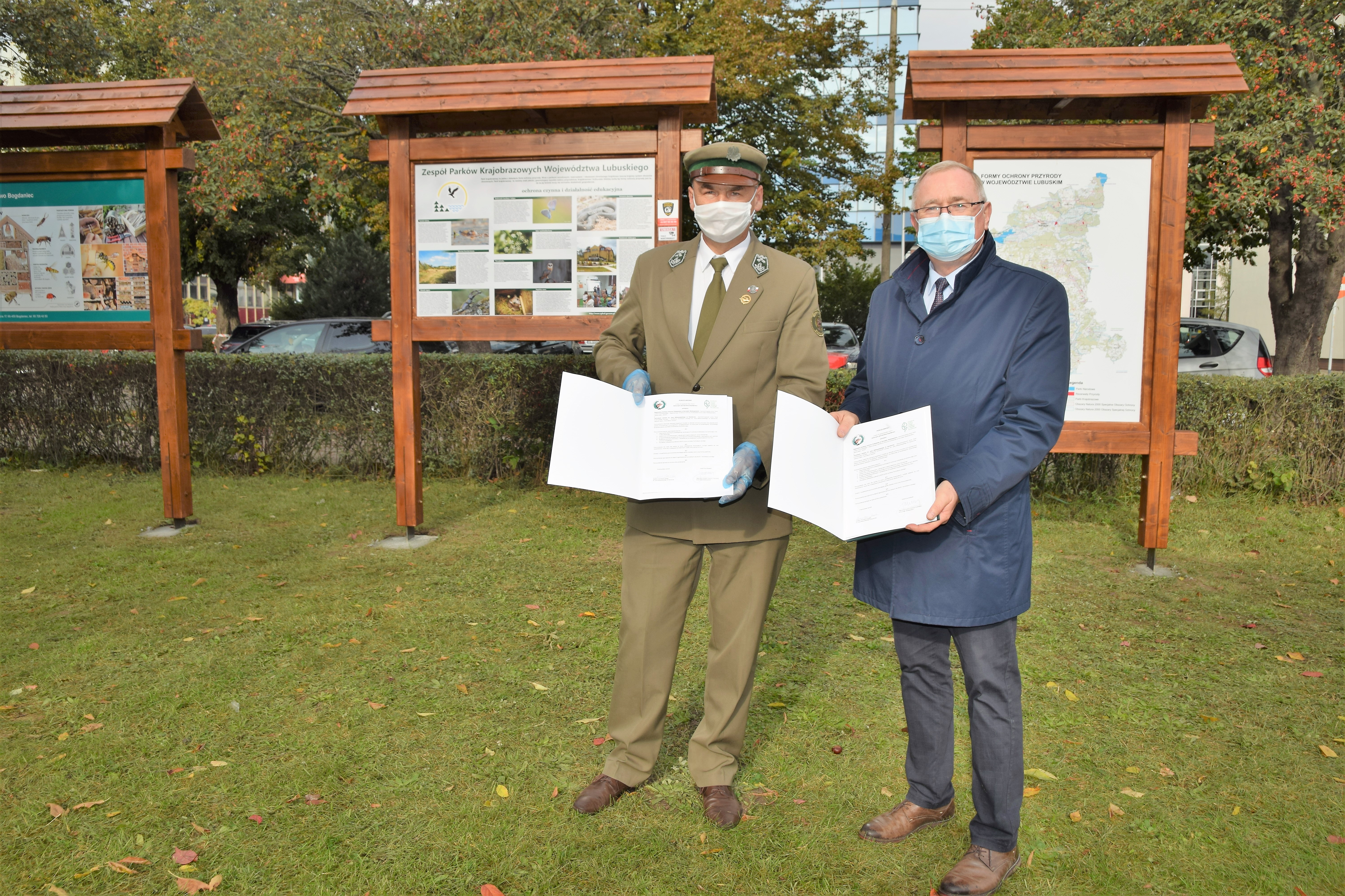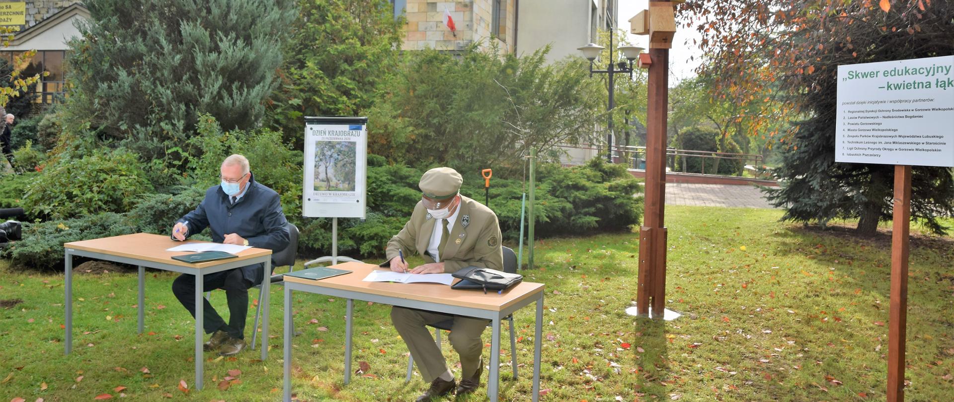 Uroczyste złożenie podpisów przez Józefa Kruczkowskiego- Regionalnego Dyrektora Ochrony Środowiska w Gorzowie Wlkp. oraz Przemysława Jarosika- dyrektora Technikum Leśnego nastąpiło w czasie oficjalnego otwarcia skweru edukacyjnego przed siedzibą RDOŚ.