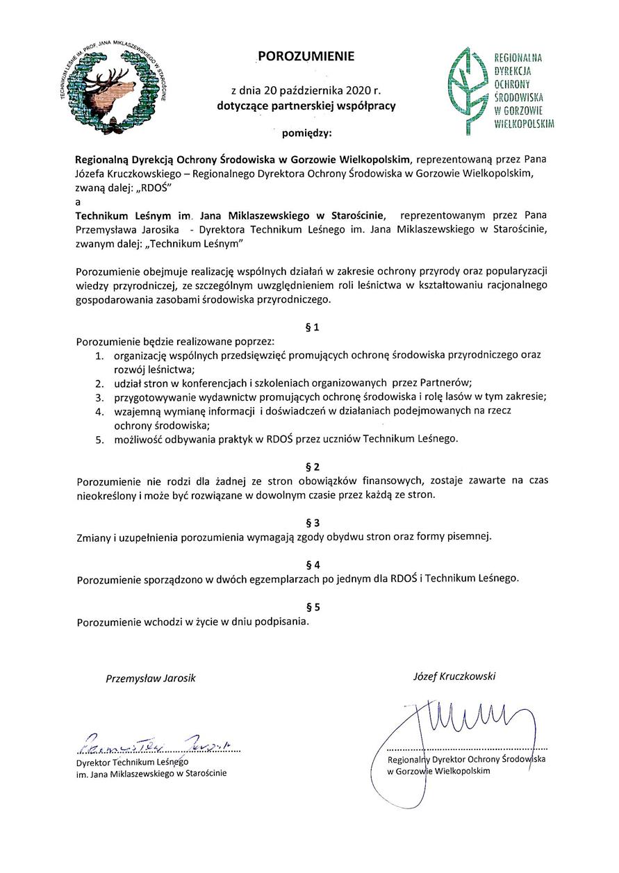 Działania na rzecz ochrony przyrody mają obecnie bardzo duże znaczenie. Ich skuteczność często zależy od współpracy podmiotów, których zakres zadań dotyczy środowiska. Takiemu właśnie współdziałaniu ma służyć podpisane 20 października br. porozumienie pomiędzy Regionalną Dyrekcją Ochrony Środowiska w Gorzowie Wielkopolskim a Technikum Leśnym im. Jana Miklaszewskiego w Starościnie.