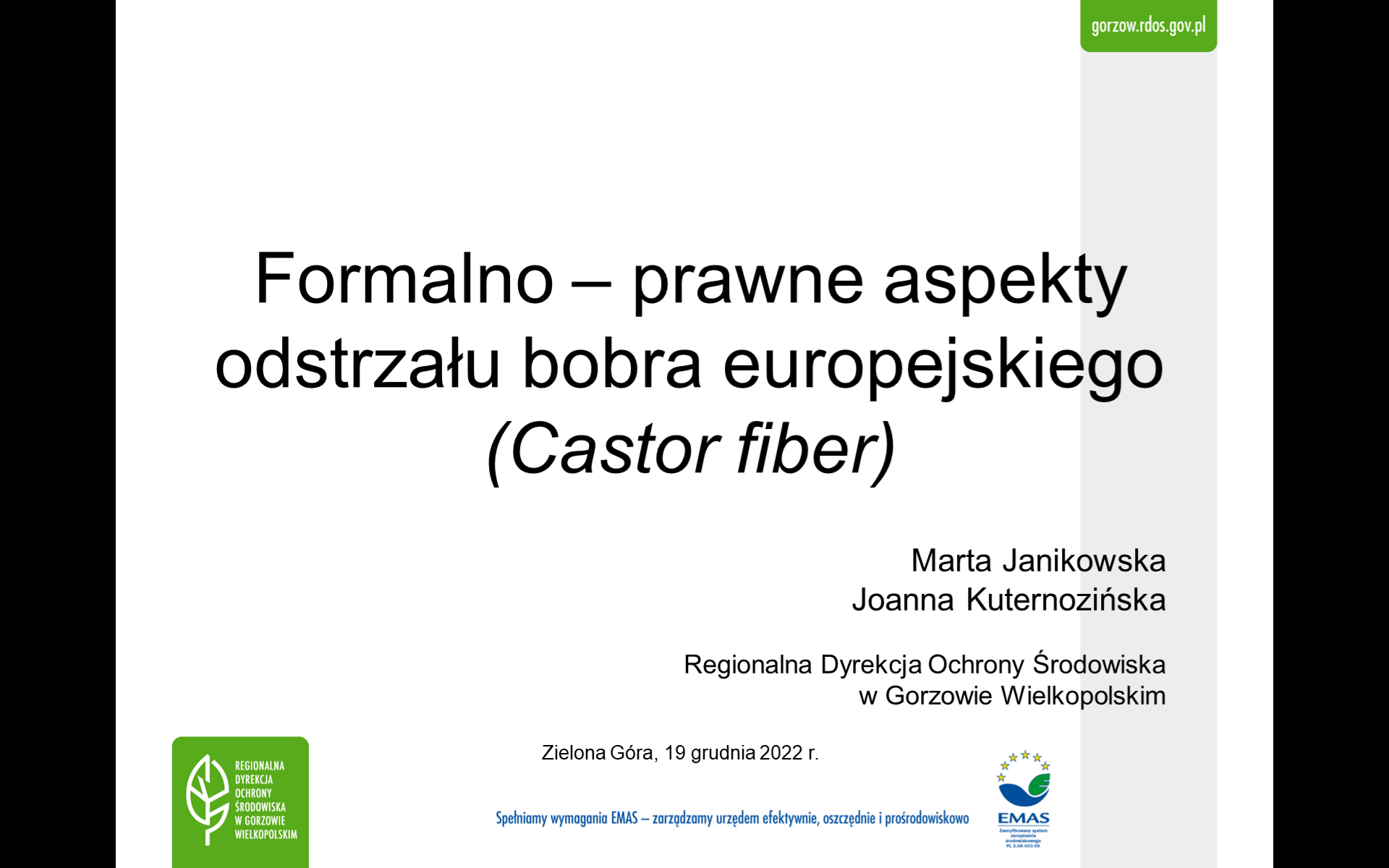 Podczas wydarzenia, które odbyło się 19 grudnia 2022 roku, pracownice Regionalnej Dyrekcji Ochrony Środowiska w Gorzowie Wielkopolskim: Marta Janikowska- Naczelnik Wydziału Ochrony Przyrody i Obszarów Natura 2000 oraz Joanna Kuternozińska- starszy specjalista ds. ochrony przyrody w Wydziale Ochrony Przyrody i Obszarów Natura 2000, wygłosiły prelekcje online dla członków Zarządu Okręgowego Polskiego Związku Łowieckiego w Zielonej Górze, którzy zamierzają uzyskać uprawnienia do odstrzału redukcyjnego bobra europejskiego na terenie obwodów łowieckich okręgu zielonogórskiego.