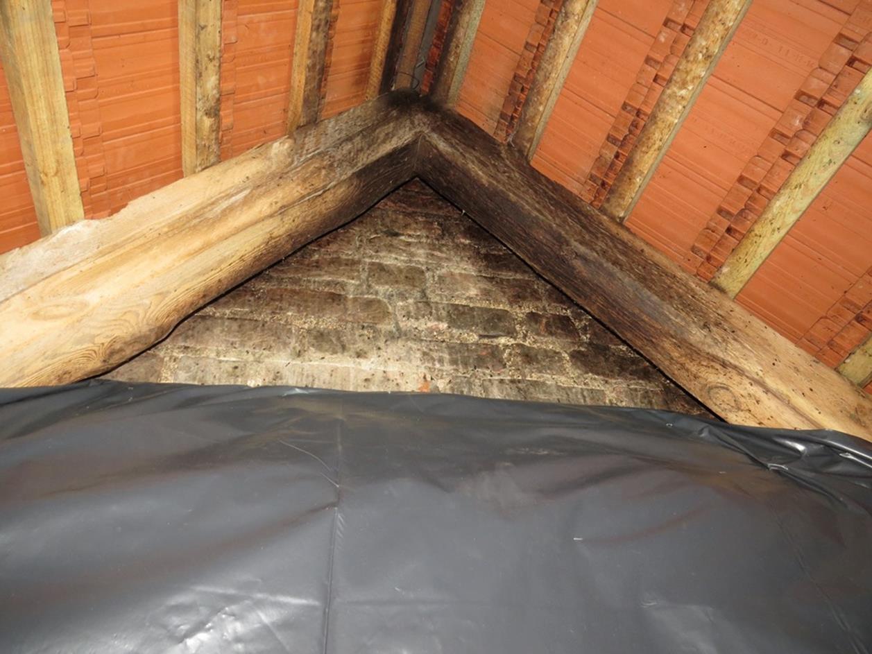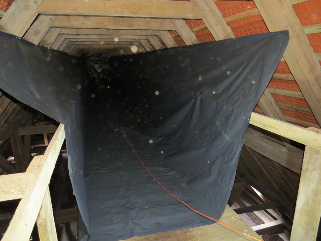 4. Posprzątano guano oraz zabezpieczono folią drewniany podest na długości, gdzie w szczycie przebywają nietoperze i ścianę szczytową między strychem a wieżą kościoła. Folia ma kształt „U” co spowoduje, że odchody nietoperzy nie będą spadały na strop kościoła.