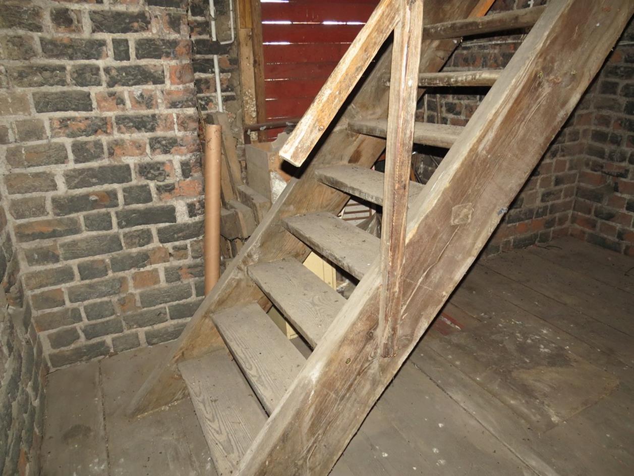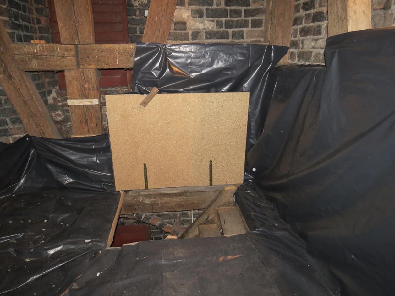 2. Pomieszczenie zostało odgrodzone od wyżej położonych poziomów wieży otwieranym włazem, który zabezpiecza przed ponowny gromadzeniem się w nim odchodów nietoperzy.