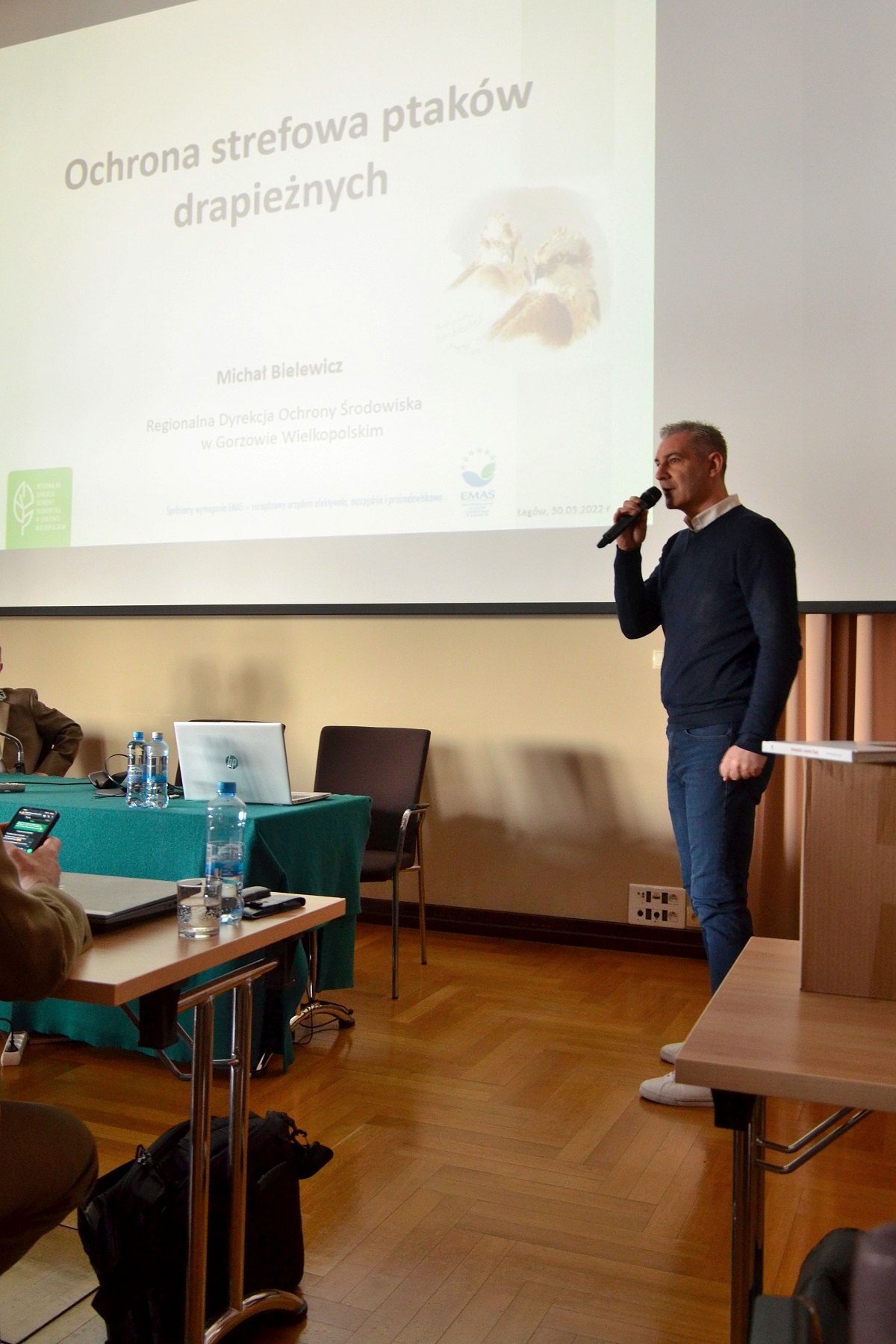 w Gorzowie Wielkopolskim, Naczelnik Wydziału Ochrony Przyrody i Obszarów Natura 2000 - Michał Bielewicz, który podczas warsztatów wygłosił prelekcje na temat zasad ochrony strefowej ptaków drapieżnych.