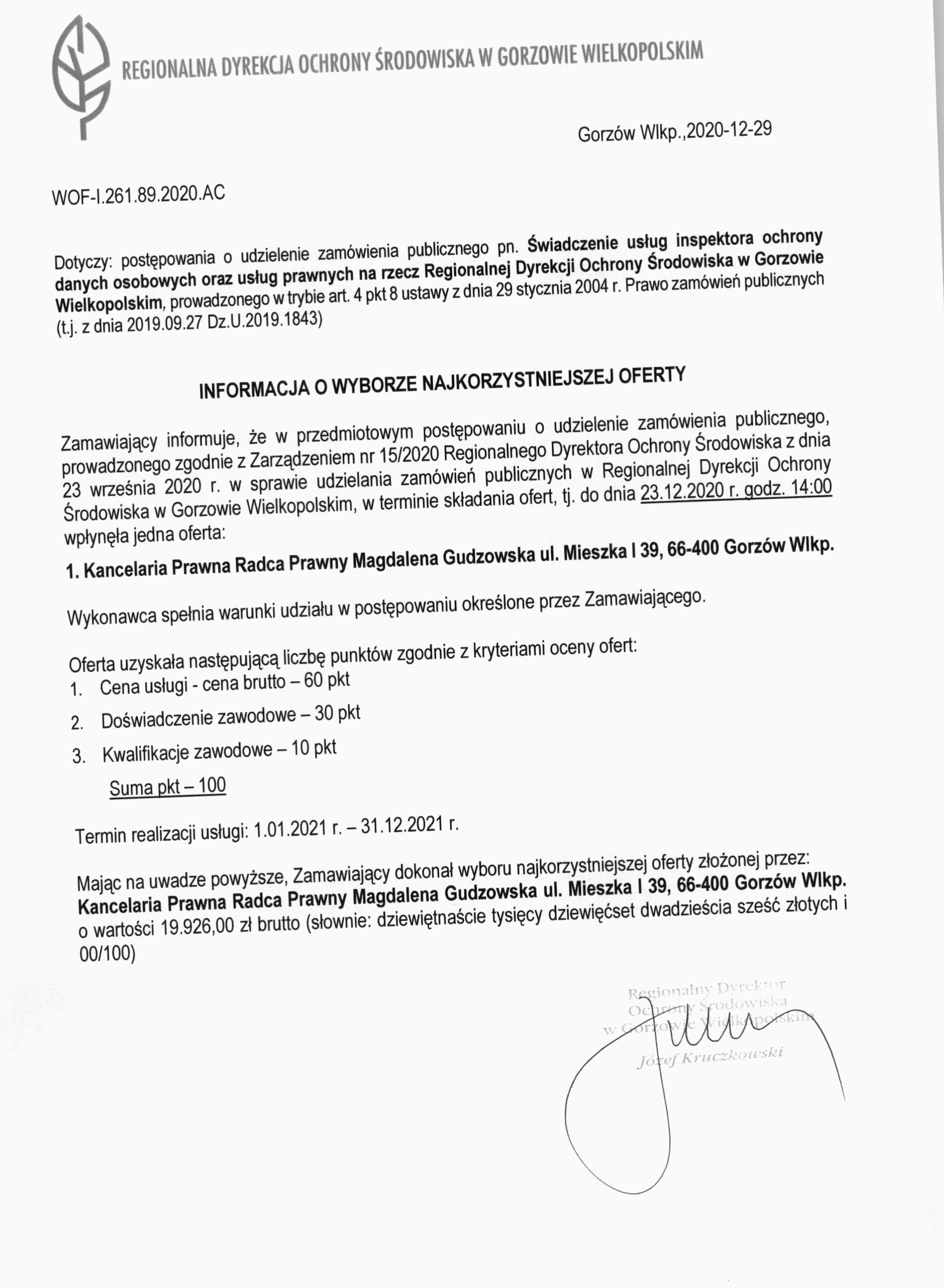 | Zapytanie ofertowe na świadczenie usługi inspektora ochrony danych osobowych oraz usług prawnych na rzecz Regionalnej Dyrekcji Ochrony Środowiska w Gorzowie Wielkopolskim | 4.0 | 21.12.2020 11:13 Joanna Markow |