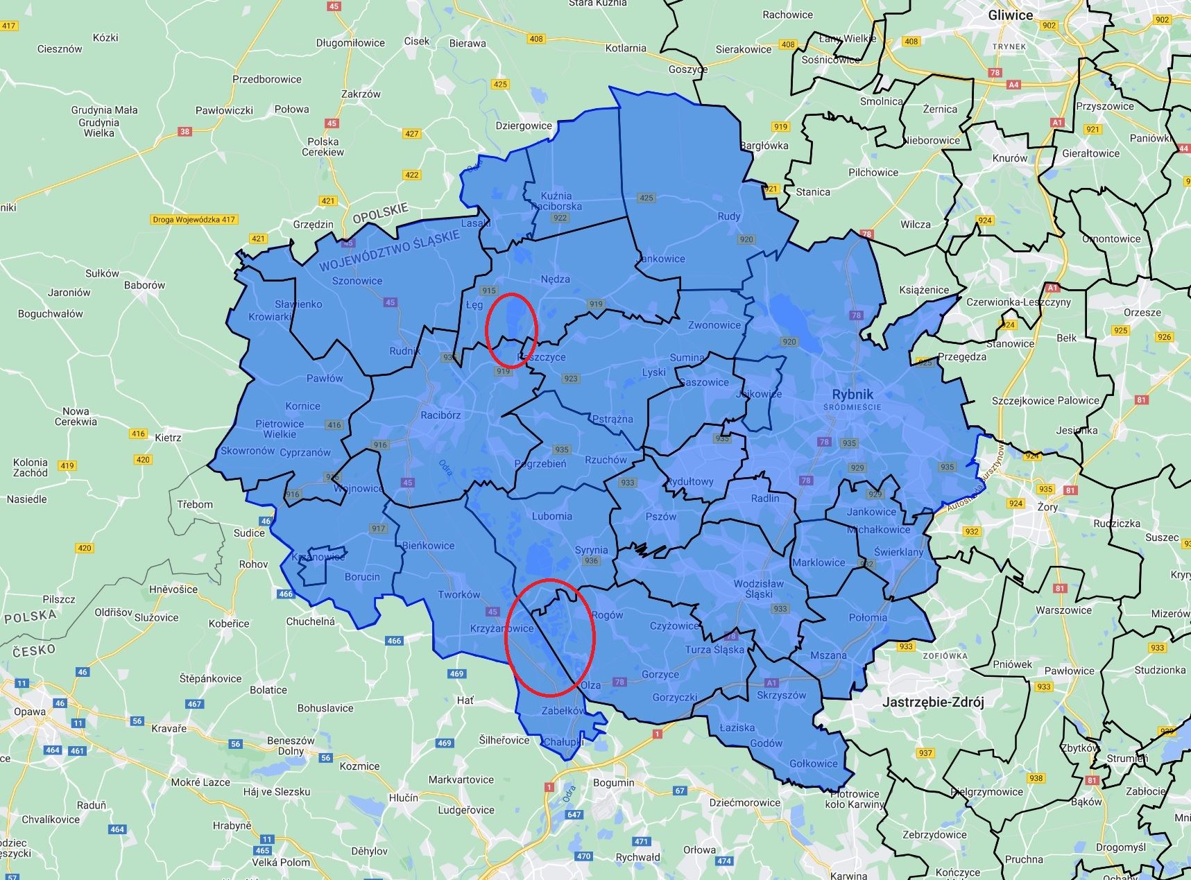 4) gminy: Gaszowice, Jejkowice, Lyski, Świerklany w powiecie rybnickim.