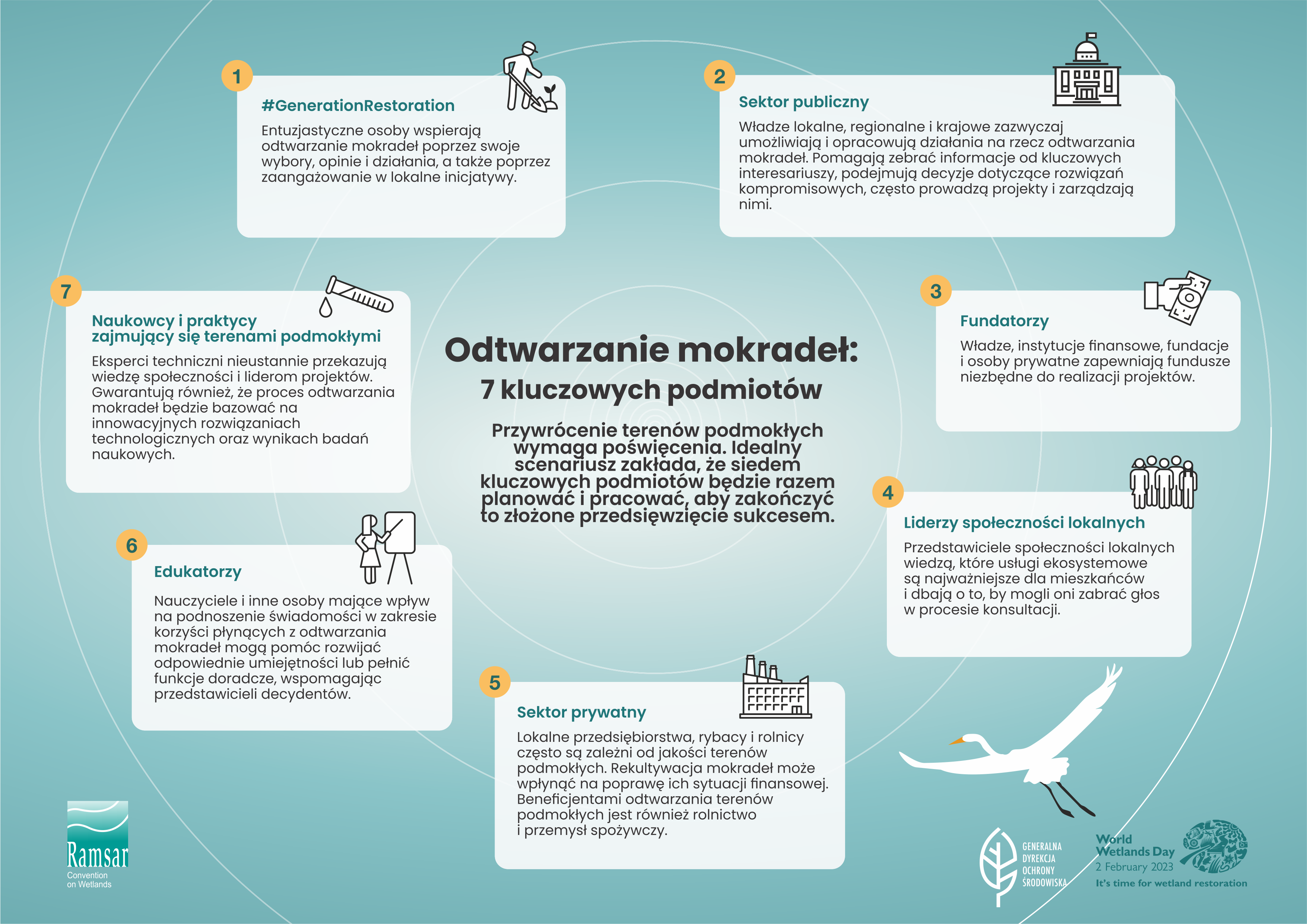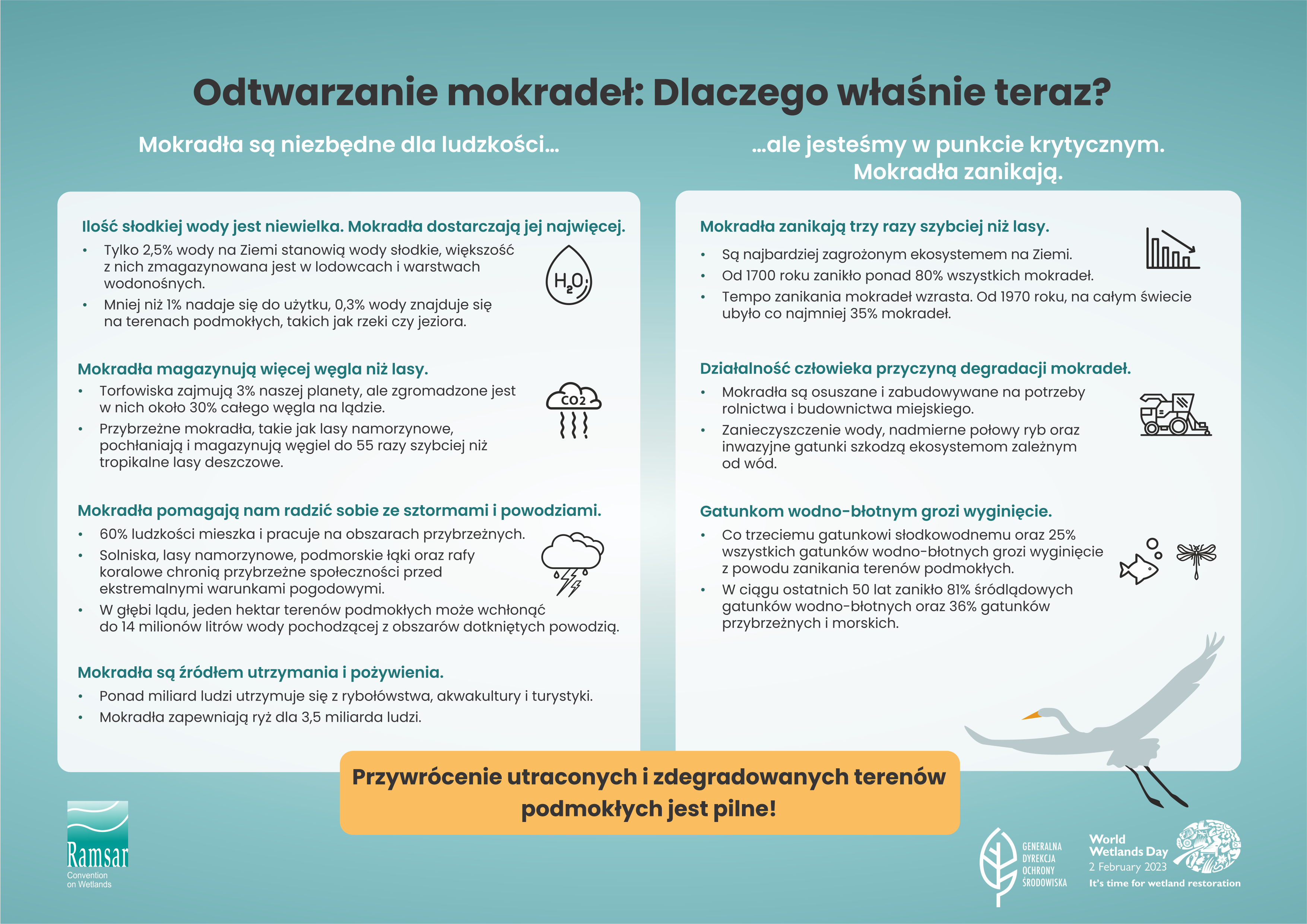 Tereny podmokłe pełnią istotne dla społeczeństwa funkcje, zaczynając od magazynowania i wody, poprzez ochronę przed sztormami oraz powodziami, na podtrzymywaniu bioróżnorodności i akumulacji węgla kończąc. Od 1970 r. ponad 35% mokradeł uległo degradacji, a proces ten postępuje coraz szybciej. Odwrócenie tego trendu ma kluczowe znaczenie dla zachowania równowagi w przyrodzie i funkcjonowania człowieka, także w kontekście adaptacji do zmian klimatu.
