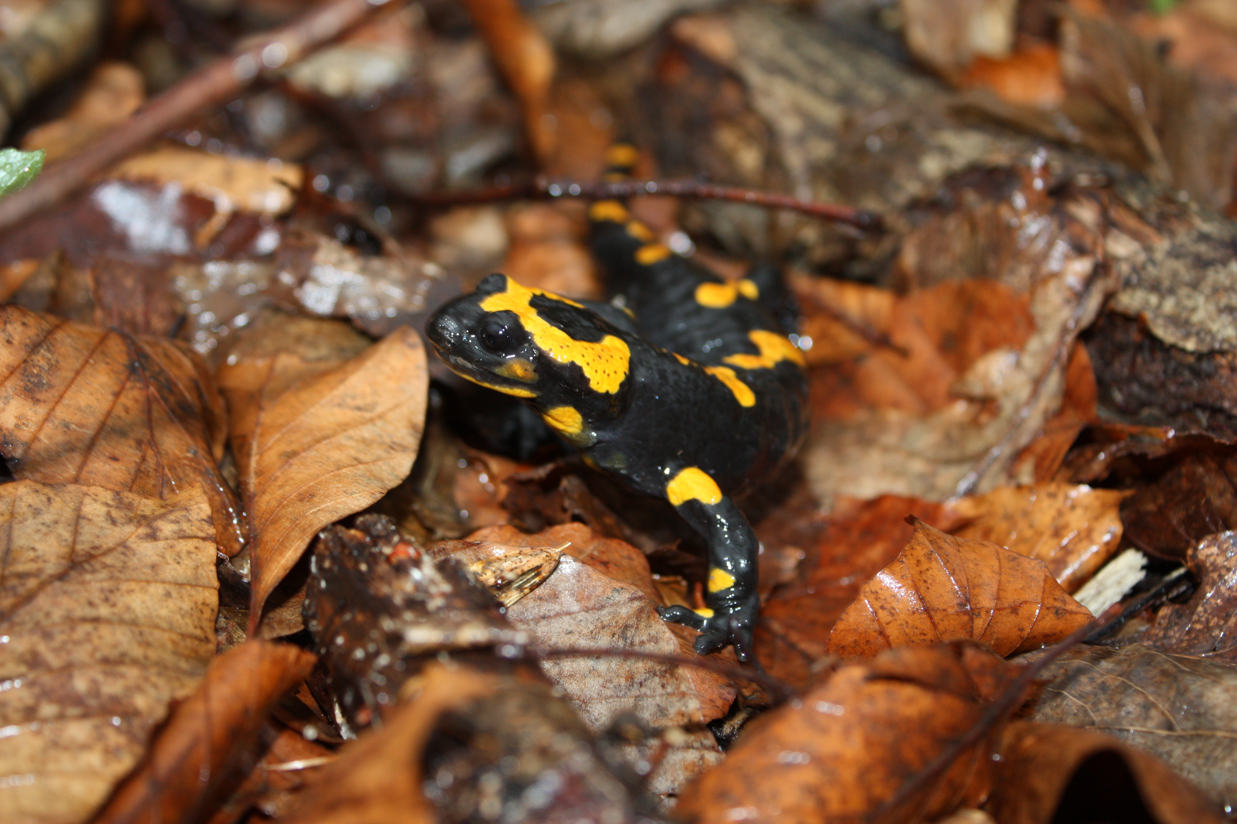 - Salamandra plamista znajduje schronienie w wilgotnym, rozkładającym się drewnie.