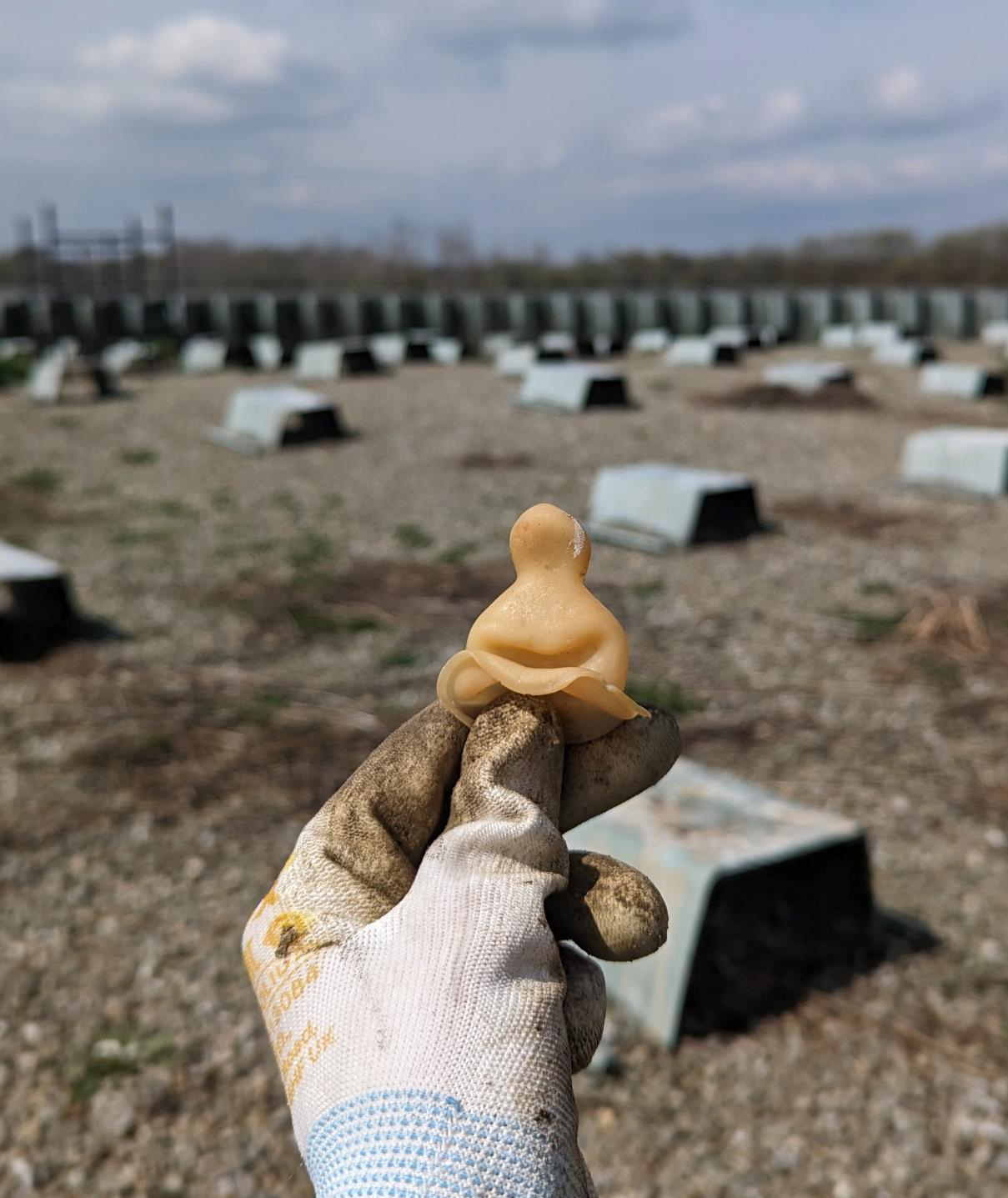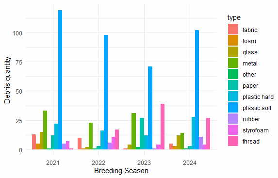Do kolonii lęgowej liczącej w 2024 roku 550 gniazd ptaków (składającej się z 3 gatunków: śmieszka, rybitwa rzeczna, mewa czarnogłowa) ptaki przyniosły ponad 230 gram odpadów.