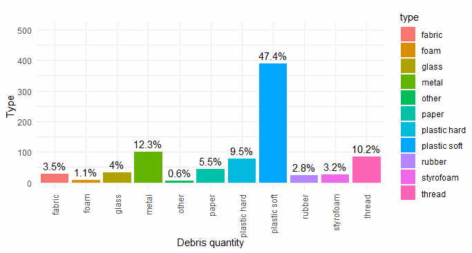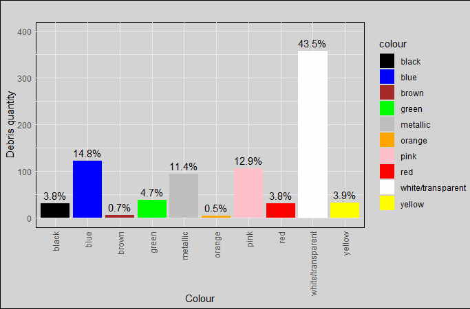 Badania na ptasiej wyspie zlokalizowanej na śląskim morzu prowadzone są od pierwszego sezonu lęgowego, zaraz po oddaniu wyspy do użytku tzn. od 2021 r. Czteroletnie analizy śmieci zebranych w ramach projektu LIFE.VISTULA.PL pozwalają skategoryzować odpady i wskazać te najczęściej przynoszone – są to miękki i twardy plastik, metal, różnego rodzaju nitki i sznurki. Ciekawym aspektem analiz jest kolor śmieci przynoszonych na wyspę. Są to przede wszystkim materiały bezbarwne lub białe (prawie połowa wszystkich śmieci) oraz niebieskie, różowe i metaliczne.