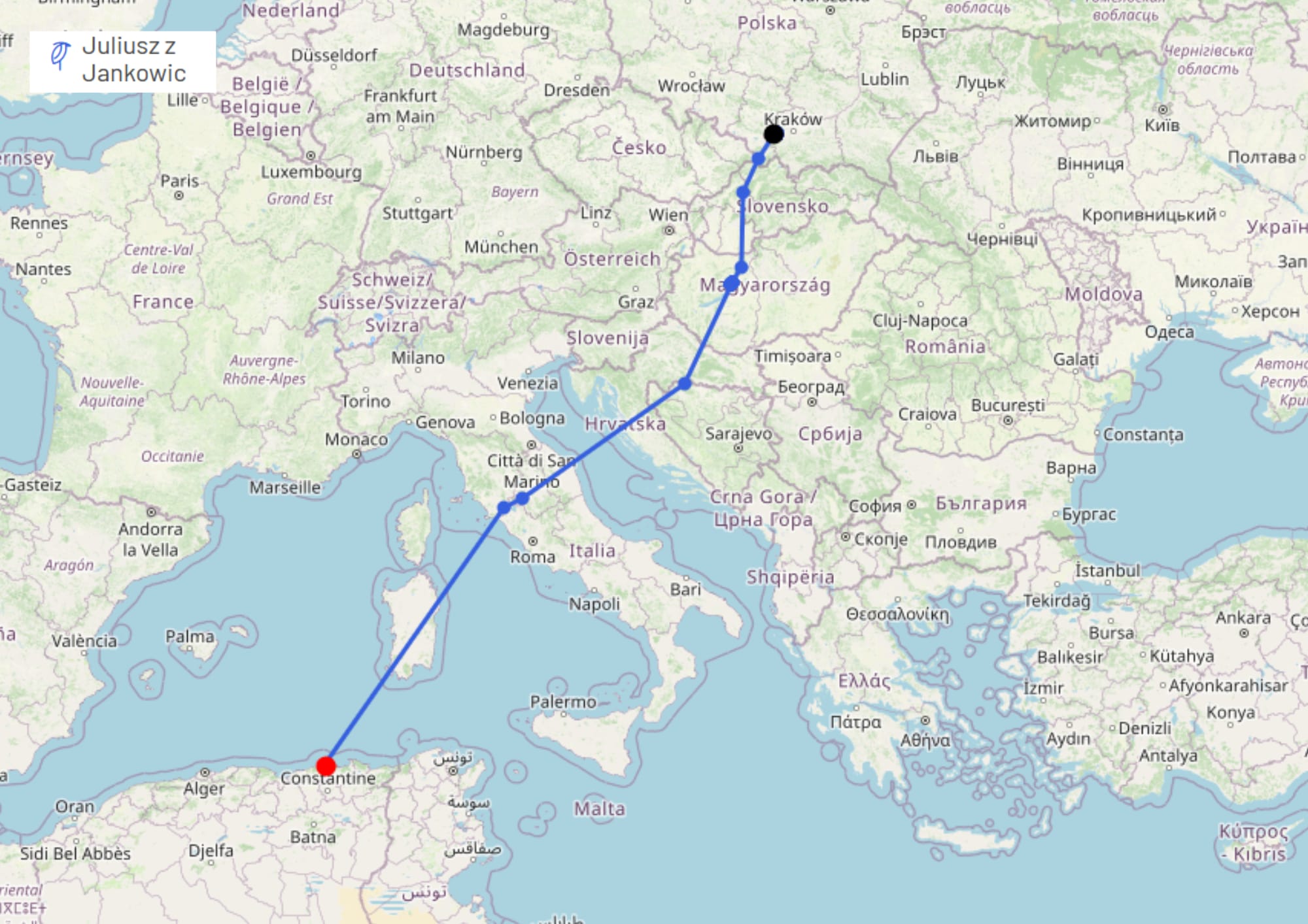 Drugi nadal aktywny nadajnik należy do Juliusza z Jankowic, który na swoje zimowe wakacje wybrał nieco krótszy dystans niż Karolina i z kolonii zlokalizowanej w pobliżu Zatora podróżuje do Afryki Północnej. Juliusz wybiera zawsze podobną trasę przelotu - w obie strony lata tym samym szlakiem przez Włochy oraz Korsykę i Sardynię, prosto do Algierii.