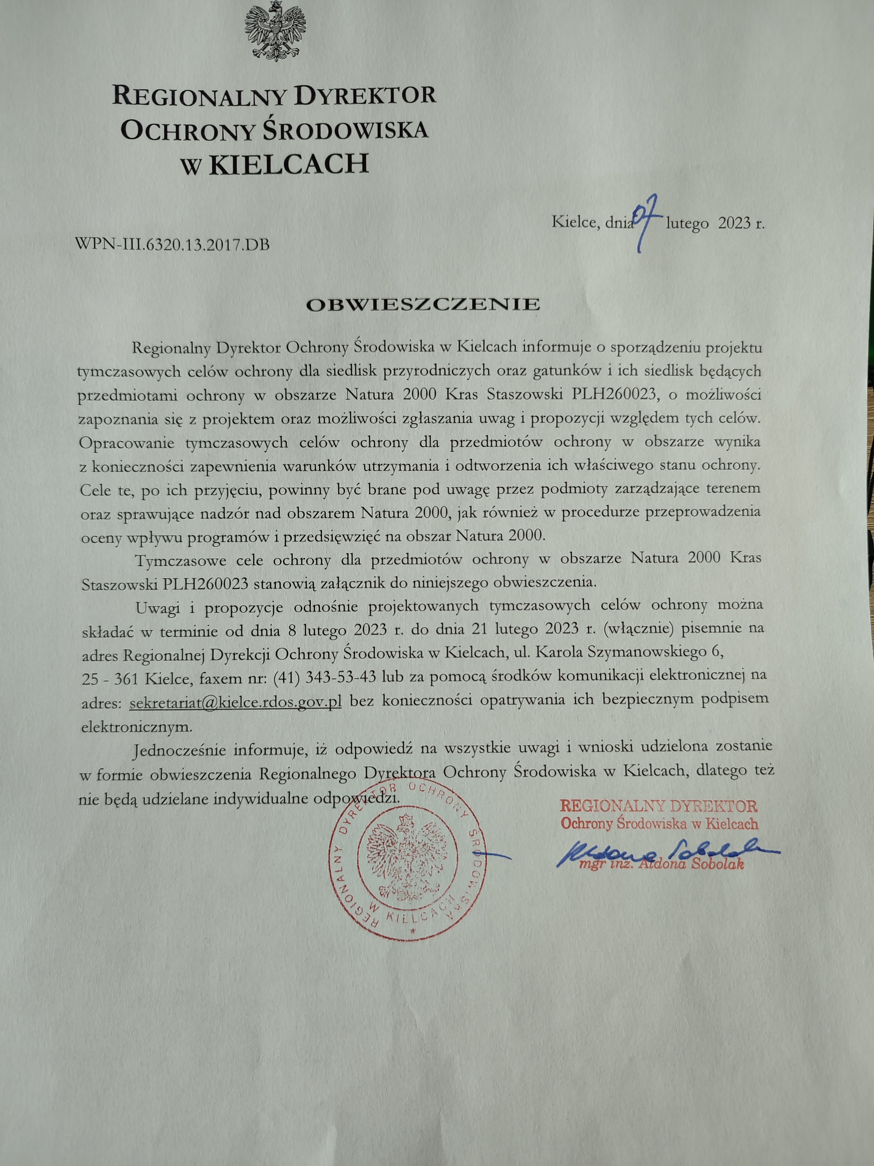 Obwieszczenie Regionalnego Dyrektora Ochrony Środowiska w Kielcach z dnia 07.02.2023 r. znak: WPN-III.6320.13.2017.DB