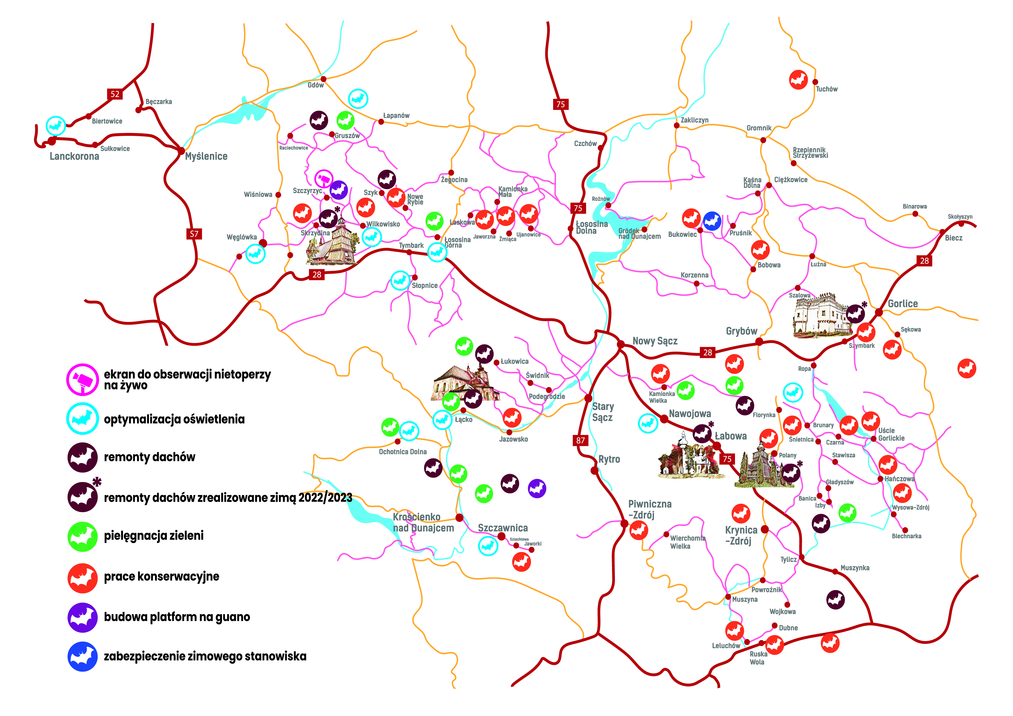 Nietoperze to nocne ssaki, które posiadają umiejętność aktywnego lotu. W okresie letnim żyją na poddaszach budynków (często kościołów) i tam przychodzą na świat młode. Zachowanie tych letnich stanowisk jest kluczowe dla ochrony zagrożonych gatunków nietoperzy. Regionalna Dyrekcja Ochrony Środowiska w Krakowie – Regionalny Konserwator Przyrody, od 2017 roku realizuje projekt, którego głównym celem jest czynna ochrona najcenniejszych w Małopolsce stanowisk nietoperzy. Najbardziej spektakularnym efektem projektu jest wymiana połaci dachowych na 9 obiektach, na strychach których swoje letnie stanowiska maja rzadkie i zagrożone gatunki nietoperzy. Do tej pory w ramach projektu zrealizowano remonty dachów: Kościoła w Izbach, Kościoła w Wojkowej, Kościoła w Łukowicy, Kościoła w Łącku, budynku dawnej plebani w Krościenku n/Dunajcem, Kościoła w Szczawnicy, Kościoła w Szyku, Kościoław Gruszowie oraz Kościoła we Florynce. W planach na sezon 2022/2023 jest jeszcze modernizacja dachów: w Kasztelu w Szymbarku, na Kościele w Łabowej, na Kościele w Polanach, a także remont poszycia drewnianej wieży Kościoła w Skrzydlnej.