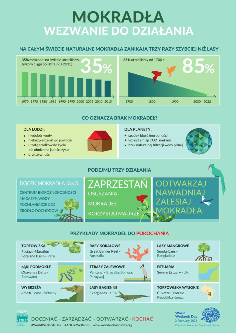 „Podejmij działania dla ochrony ludzi i przyrody!” to hasło Światowego Dnia Mokradeł 2022. Jest to wezwanie do szerokich działań na rzecz ocalenia cennych terenów podmokłych.
