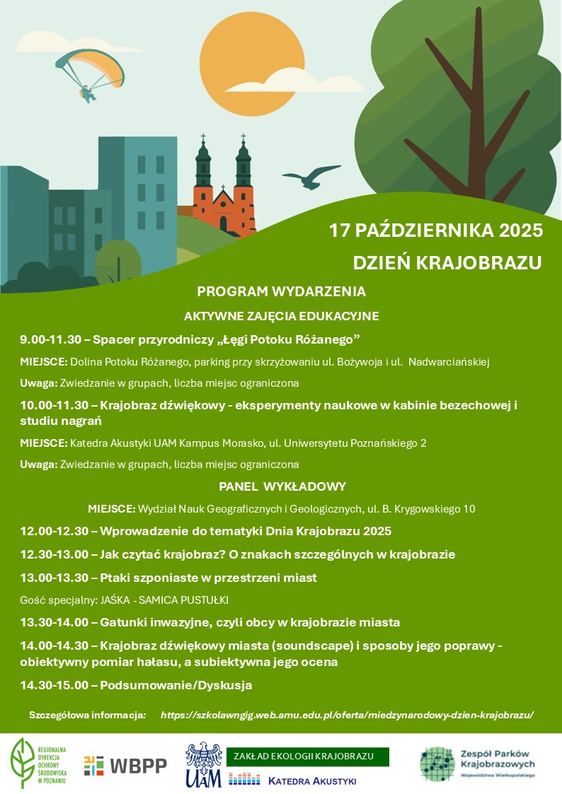 Wydział Nauk Geograficznych i Geologicznych UAM wraz z Regionalną Dyrekcją Ochrony Środowiska w Poznaniu, Wielkopolskim Biurem Planowania Przestrzennego oraz Zespołem Parków Krajobrazowych Województwa Wielkopolskiego serdecznie zapraszają na obchody Dnia Krajobrazu, które odbędą się w dniu 17 października 2025 roku w godz. 9.00-15.00. Hasłem przewodnim wydarzenia jest symbioza natury z człowiekiem, której wyrazem są krajobrazy miejskie. W programie wydarzenia przewidziano aktywne zajęcia edukacyjne oraz panel wykładowy. Aktywne zajęcia edukacyjne obejmują spacer przyrodniczy umożliwiający zapoznanie się z użytkiem ekologicznym „Łęgi Potoku Różanego” oraz eksperymenty naukowe dedykowane krajobrazowi dźwiękowemu. Panel wykładowy poświęcony jest różnym aspektom funkcjonowania krajobrazów miejskich. Wystąpienia uczestników panelu dostarczą intersujących informacji o znakach szczególnych w krajobrazie, skrzydlatych mieszkańcach miast, gatunkach inwazyjnych w przestrzeni miejskiej oraz dźwiękach, które towarzyszą mieszkańcom miast.