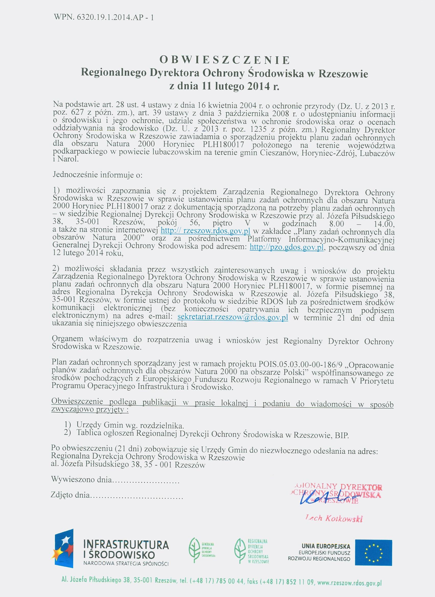 Obwieszczenie Regionalnego Dyrektora Ochrony Środowiska w Rzeszowie z dnia 11 lutego 2014 r. o sporządzeniu projektu planu zadań ochronnych dla obszaru Natura 2000 Horyniec PLH180017.