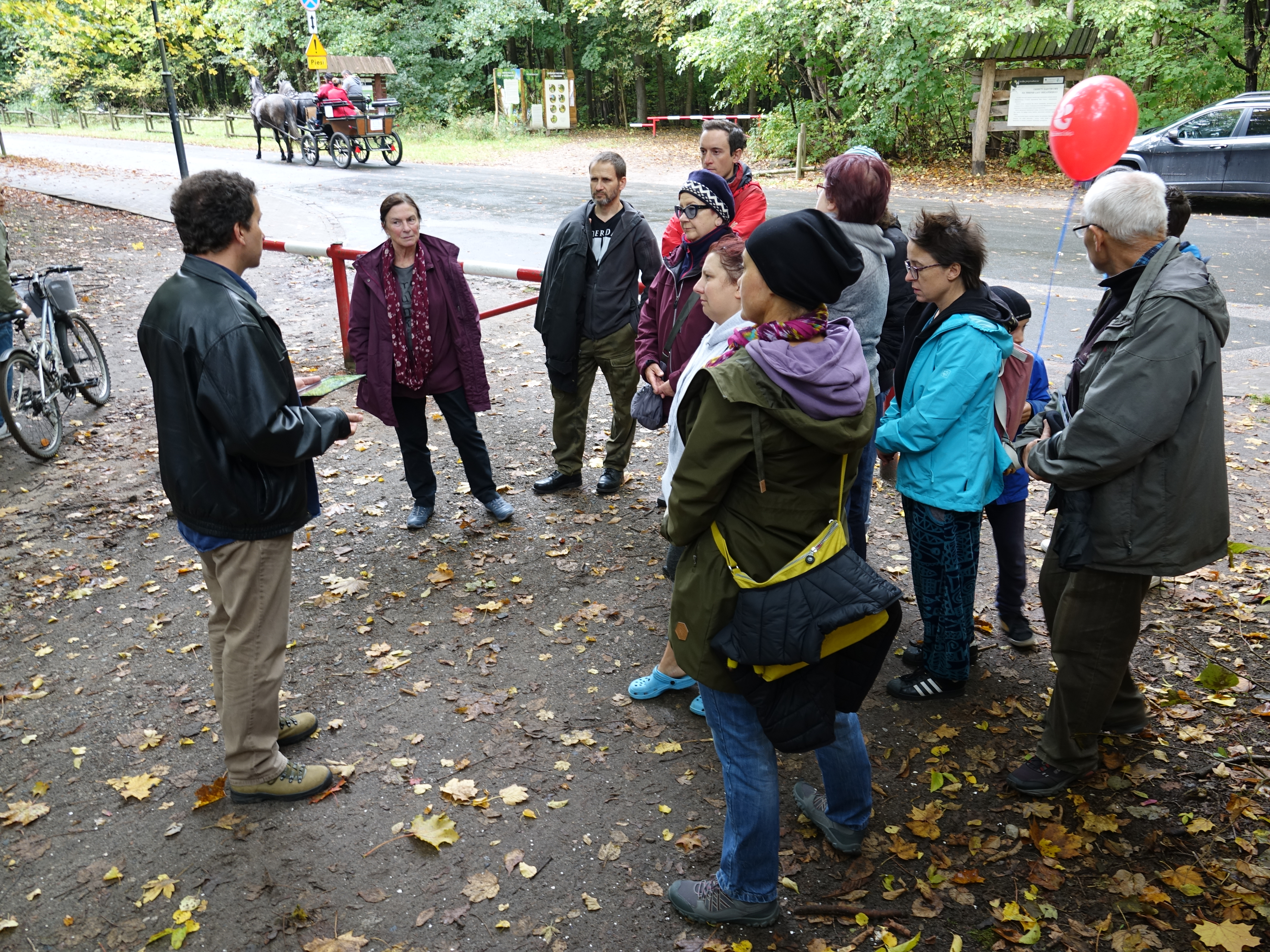 Chwilę po godzinie 12.00 wyruszyła grupa uczestników Spaceru Krajobrazowego po Lesie Bielańskim. Pracownik Regionalnej Dyrekcji Ochrony Środowiska w Warszawie przybliżył niezwykłą różnorodność form rzeźby terenu tego rezerwatu (równina polodowcowa, trzy tarasy rzeczne (zróżnicowane roślinnie), jary, wąwozy, dolinka Potoku Bielańskiego i Rudawki i wreszcie wydma i wał wydmowy). Uczestnicy spaceru dowiedzieli się jednak znacznie więcej na temat samego rezerwatu - rozpoznawali gatunki drzew charakterystyczne dla łęgów i grądów. Poznali bliżej chronionych mieszkańców tego miejsca - kozioroga dębosza i pachnicę dębową. Obserwowali grzyby, a nawet ryby (cierniki w Rudawce).