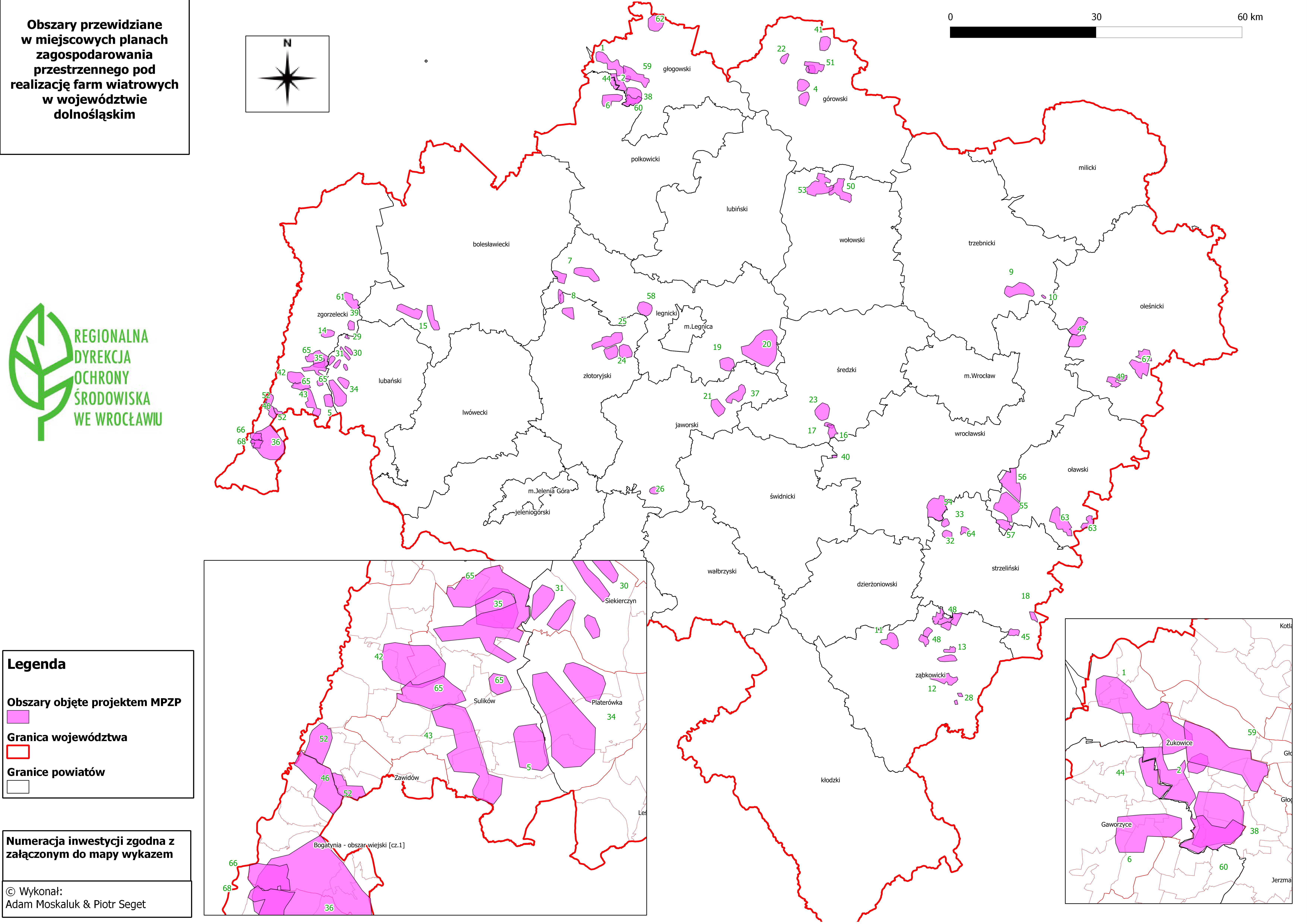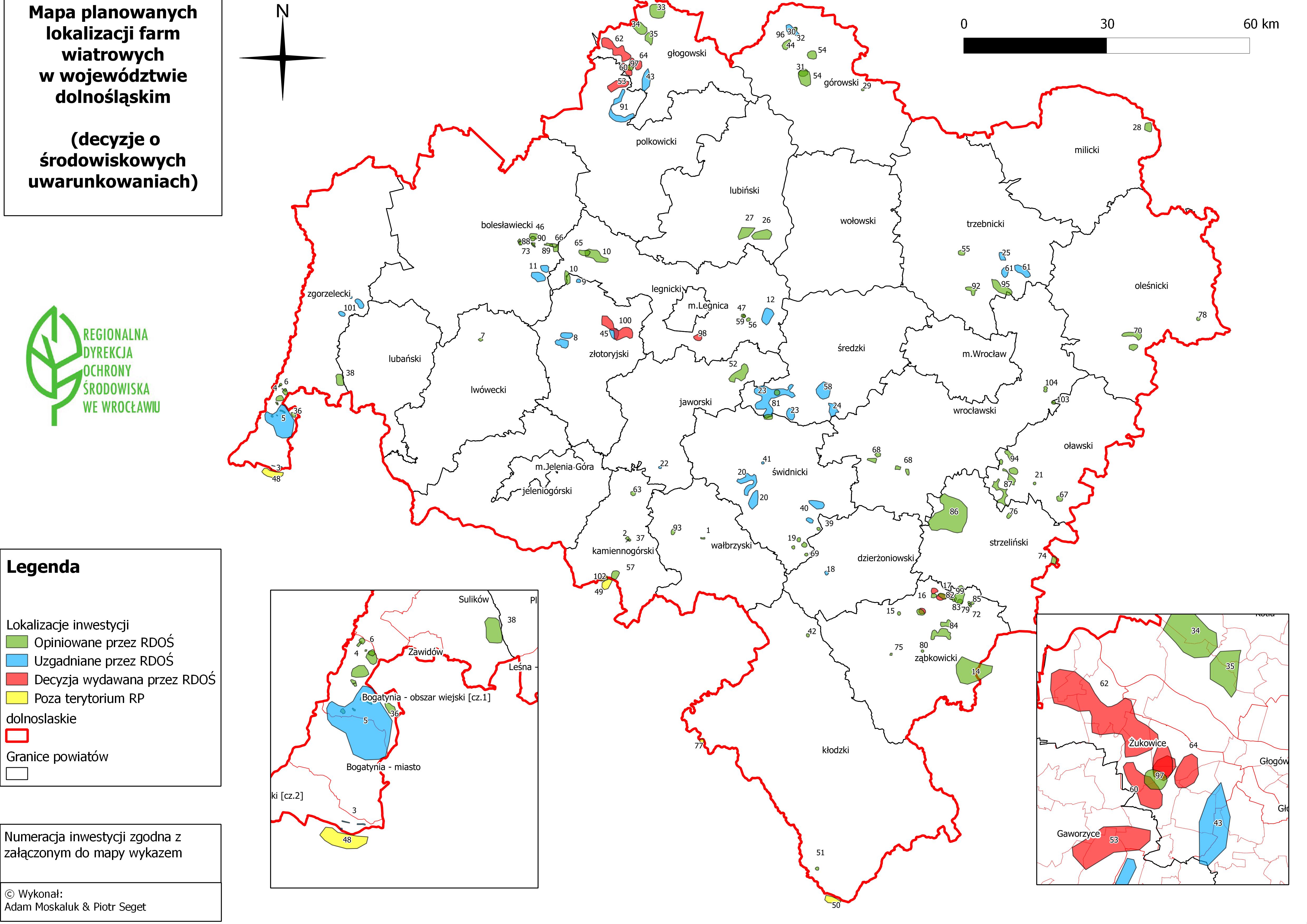 Udostępniamy mapę oraz wykaz przedstawiające lokalizację przedsięwzięć i planów związanych z realizacją elektrowni i farm wiatrowych w województwie dolnośląskim, w których na jednym z etapów postępowania administracyjnego udział brał Regionalny Dyrektor Ochrony Środowiska we Wrocławiu. Uwzględnione zostały także inwestycje polegające na realizacji farm wiatrowych poza terytorium Rzeczpospolitej Polskiej, dla których prowadzone jest postępowanie w sprawie transgranicznego oddziaływania na środowisko. Niniejsza mapa może być pomocna przy opracowywaniu dokumentacji niezbędnej do uzyskania decyzji o środowiskowych uwarunkowaniach, w tym w szczególności w aspekcie oceny skumulowanego oddziaływania planowanych do zrealizowania elektrowni i farm wiatrowych na klimat akustyczny oraz awifaunę i hiropterofanę.
