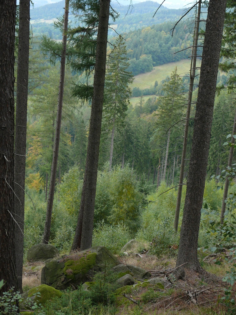 Góry do około 1000 m n.p.m. naturalnie porastają buczyny, a im wyżej tym występuje więcej świerka i jodły. Sudecki bór świerkowy to ubogi las, w którym występują paprocie nerecznice: szerokolistna i krótkoostna. W zamierających świerkach na przedgórzu Sudeckim schronienia znajduje leśny nietoperz mopek zachodni. W świerczynie Masywu Śnieżnika, Gór Bialskich, Karkonoszy i Gór Izerskich żyje krzyżodziób świerkowy, który dzięki niezwykłemu kształtowi dzioba potrafi wyłuskiwać nasiona ze świerkowych szyszek.