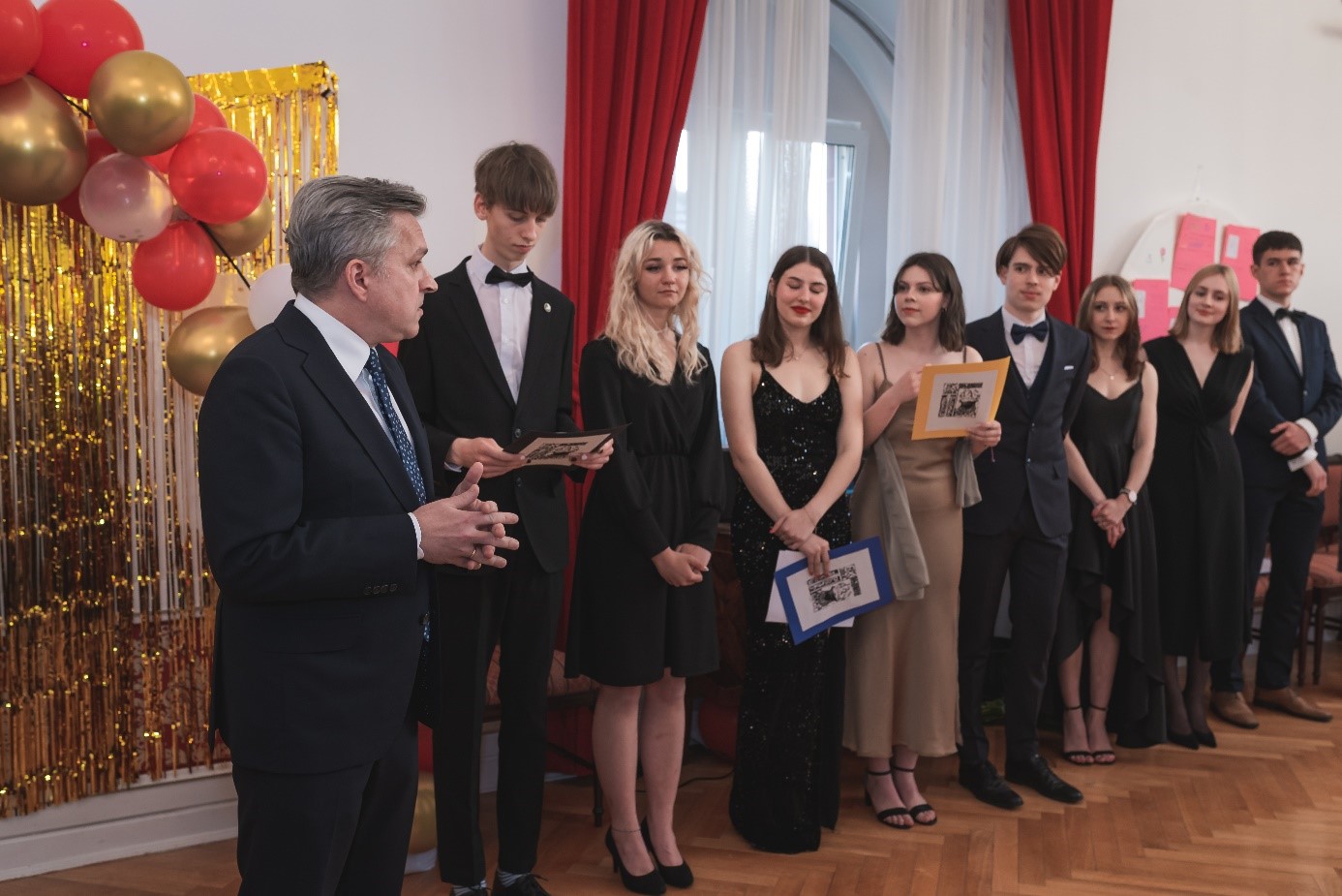 Otwierając bal, ambasador Jerzy Baurski życzył licealistom sukcesów podczas egzaminu dojrzałości i wyborów życiowych dających satysfakcję i spełnienie. W wydarzeniu uczestniczył także kierownik Wydziału Konsularnego Ambasady RP w Paryżu – p. konsul Andrzej Szydło oraz zastępca Szefa Sztabu w Dowództwie Eurokorpusu – gen. bryg. Adam Marczak, którzy przyłączyli się do tych życzeń. Zebrani wysłuchali również listu, skierowanego do młodzieży przez księdza Ryszarda Górskiego - proboszcza polskiej parafii w Strasburgu. Wśród przybyłych gości byli obecni także przedstawiciele francuskiego grona pedagogicznego.