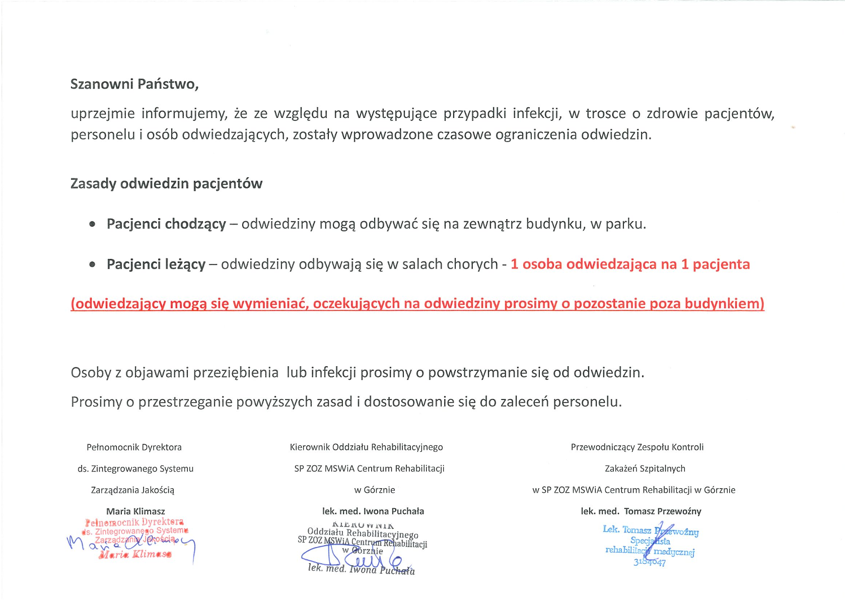 uprzejmie informujemy, że ze względu na występujące przypadki infekcji, w trosce o zdrowie pacjentów, personelu i osób odwiedzających, zostały wprowadzone czasowe ograniczenia odwiedzin.