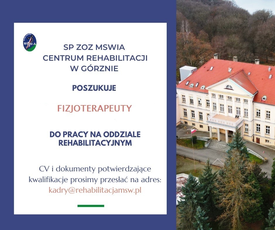 SP ZOZ MSWiA Centrum Rehabilitacji w Górznie w związku z rozwojem placówki poszukuje fizjoterapeutów do pracy na oddziale rehabilitacyjnym.