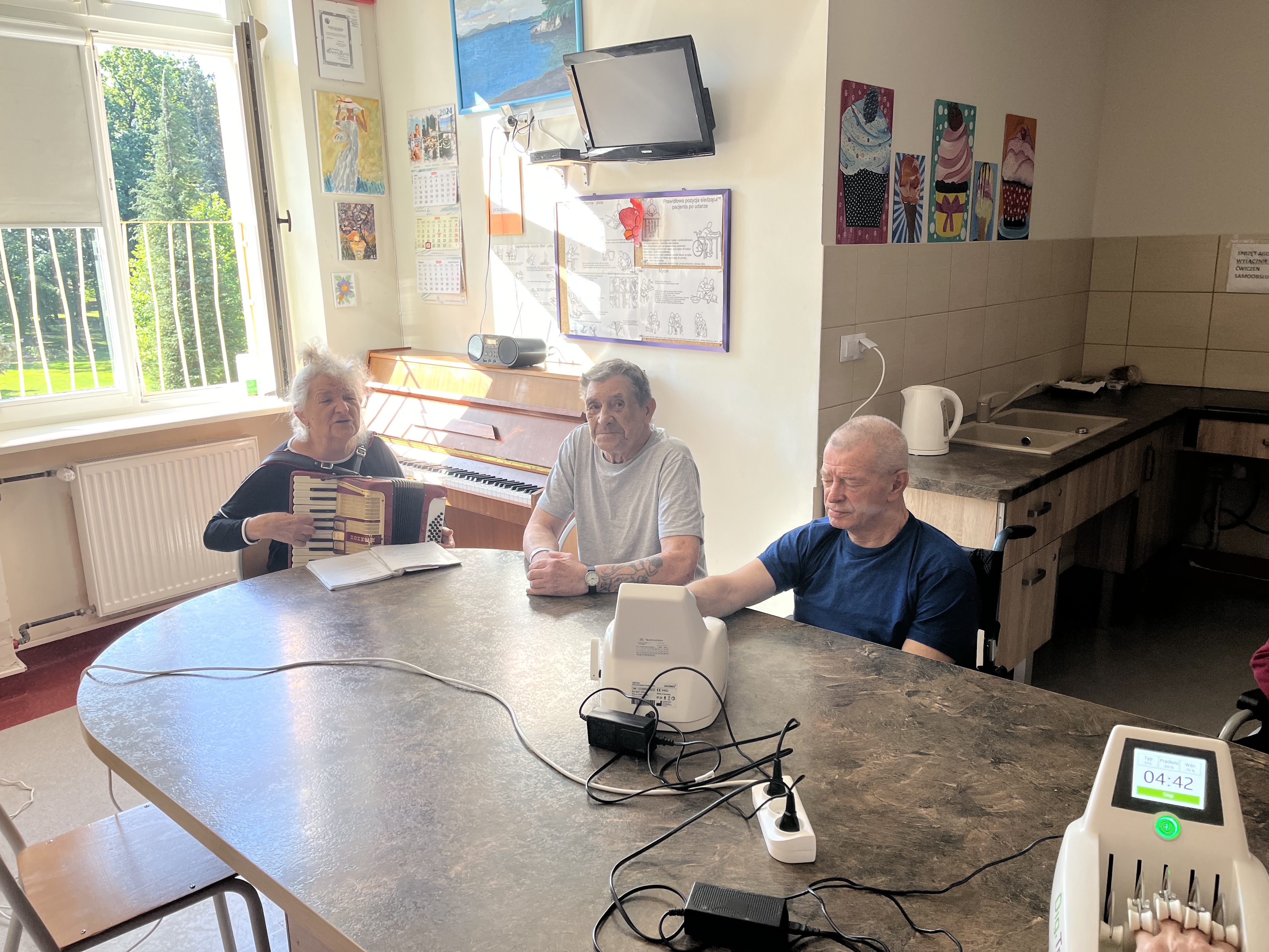 Dodatkowo, od czasu do czasu nasi podopieczni mogą się odprężyć, słuchając gry na pianinie, a ostatnio mieliśmy również przyjemność posłuchać, jak jedna z naszych wspaniałych pacjentek zagrała na akordeonie. To świetny sposób na uprzyjemnienie czasu.