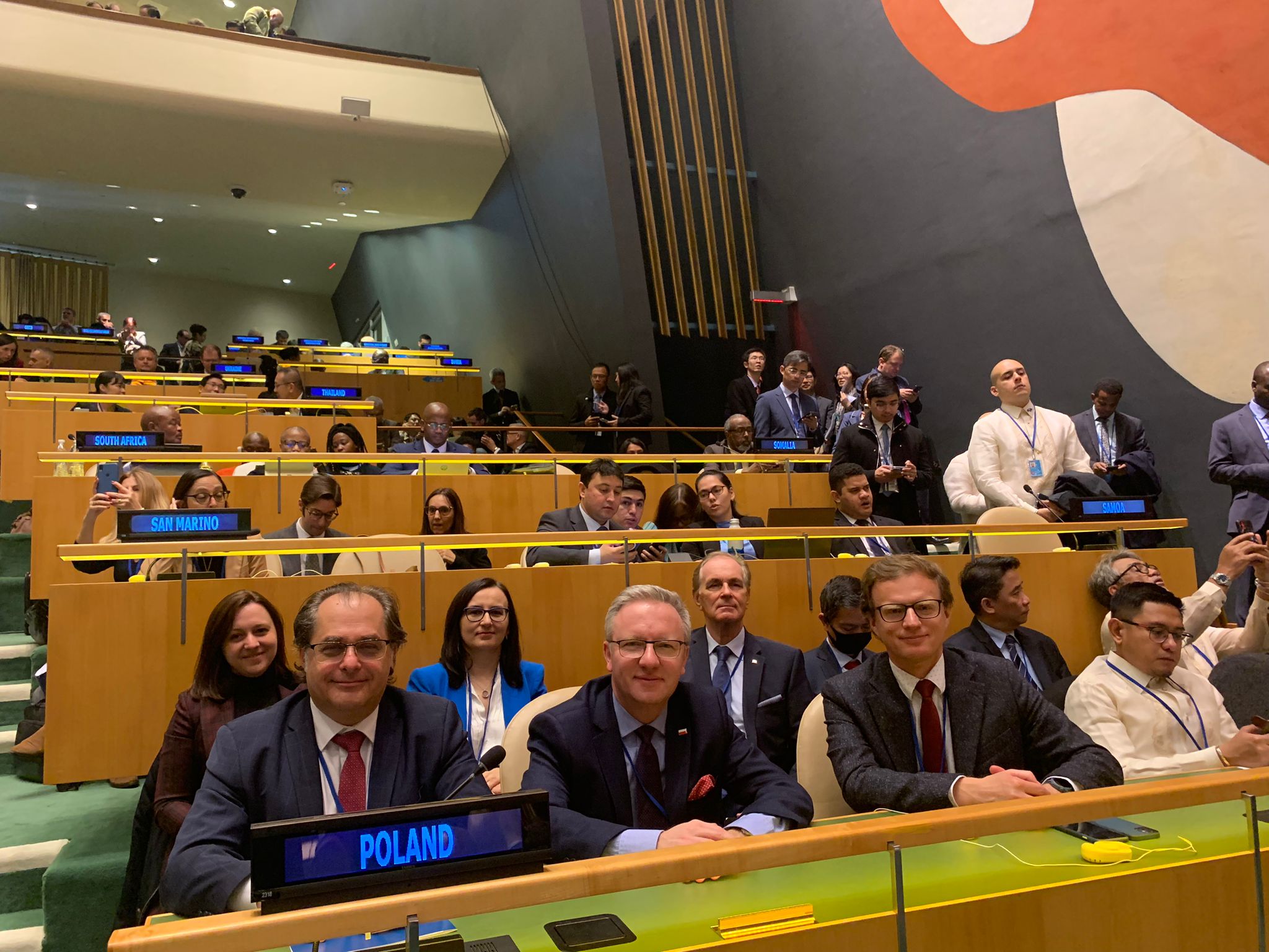 Sesje plenarne Konferencji wodnej ONZ 2023 poświęcone były oświadczeniom państw członkowskich i innych interesariuszy. Pan Minister Marek Gróbarczyk zabrał głos podczas sesji plenarnej Konferencji, która odbyła się w czwartek 23 marca. Wykorzystując sposobność, jakim jest zabieranie głosu na forum ONZ, Pan Minister ogłosił polskie dobrowolne zobowiązanie „Rozwój, rozpowszechnianie i wdrażanie zaawansowanych rozwiązań przyrodniczych, opartych na transdyscyplinarnej ekohydrologii” jako polski wkład do Programu działań na rzecz wody.
