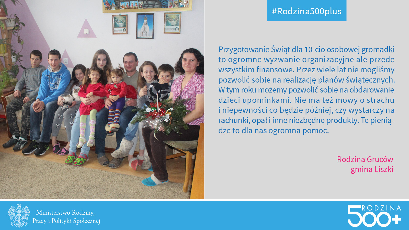 - Dla Rodzin Zastępczych, program 500+, pozwala na rekompensatę deficytów dzieci, które do nas trafiają - mówią Maja i Waldemar Zadrożni z Gdyni. - Dzięki programowi, możemy im zapewnić dodatkowe zajęcia u specjalistów, rehabilitacje, realizujemy ich hobby, takie jak: judo, piłka nożna i pływanie. To pozwala zapewnić im pewniejszy start w przyszłości. Jeżeli chodzi o okres świąteczny, to 500+ pozwolił na zakup okazalszych prezentów i zapewnienie dzieciom wszystkiego, o czym marzyły. W tej chwili w naszej rodzinie jest siedmioro dzieci przysposobionych. Mamy też swojego syna. 500+ jest dużym wsparciem.