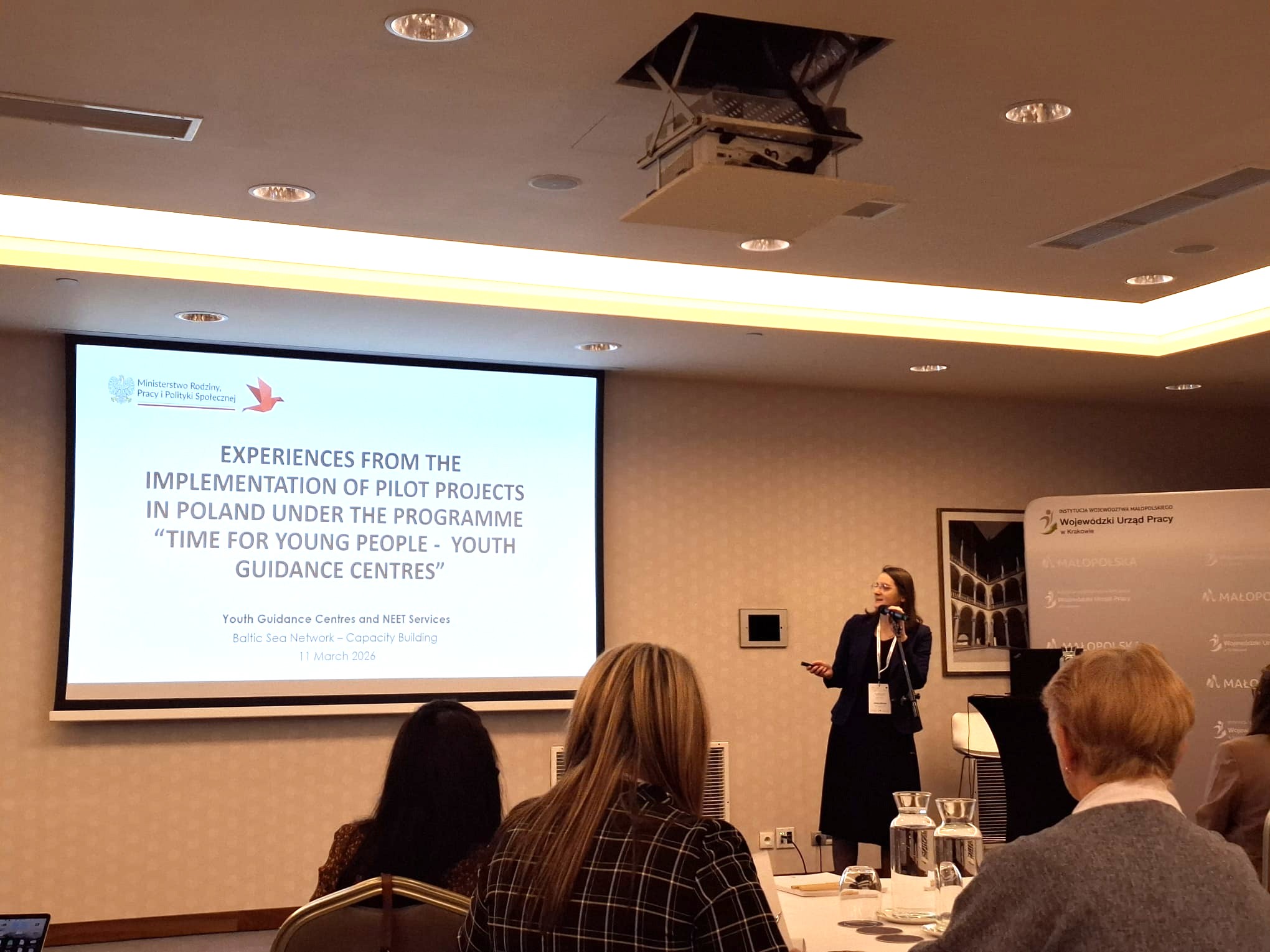 W dniach 10-12 marca 2026 r. przedstawicielki Departamentu Rynku Pracy wzięły udział w konferencji „Youth Guidance Centres and NEET Services. Baltic Sea Network – Capacity Building”, zorganizowanej przez Koordynatorów obszaru tematycznego „Edukacja” SUE RMB wspólnie z WUP w Krakowie. Przedstawicielki MRPiPS zaprezentowały działania podejmowane w Polsce w ostatnich latach na rzecz aktywizacji zawodowej osób do 30 roku życia, w szczególności projekty pilotażowe „Czas na młodych – punkty doradztwa dla młodzieży”, które były prowadzone w latach 2023-2024 przez 76 PUP i zapewniły wsparcie kilkudziesięciu tysiącom młodych ludzi.