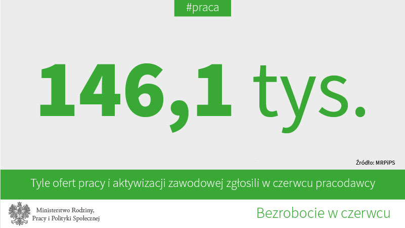 Liczba bezrobotnych w końcu czerwca br. była o 239,7 tys. osób niższa niż przed rokiem (spadek o 17,2%). Liczba wolnych miejsc pracy i miejsc aktywizacji zawodowej zgłoszonych przez pracodawców do urzędów pracy w czerwcu 2017 roku wyniosła 146,1 tys.