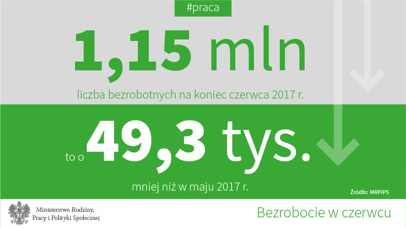 Liczba bezrobotnych w końcu czerwca 2017 roku wyniosła 1,15 mln osób i w porównaniu do maja br. spadła o 49,3 tys. osób (o 4,1%). Spadek miał miejsce we wszystkich województwach, najsilniej w: lubuskim (o 5,9%, czyli 1,7 tys. osób), pomorskim (o 5,2%, czyli 2,9 tys. osób) i warmińsko-mazurskim (o 5,1%, czyli o 3,3 tys. osób).
