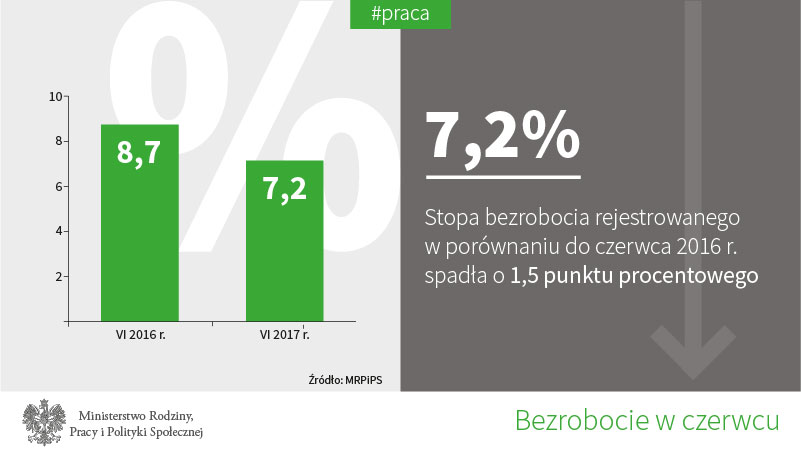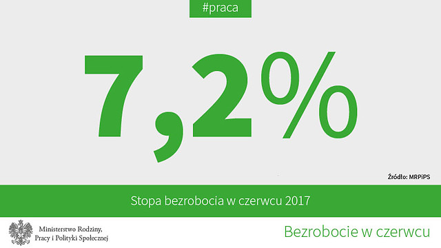 7,2% - tyle według szacunków Ministerstwa Rodziny, Pracy i Polityki Społecznej wyniosła stopa bezrobocia w czerwcu br. To o 0,2 pkt. proc. mniej niż miesiąc wcześniej i o 1,5 pkt. proc. mniej niż rok temu. To najniższe bezrobocie w czerwcu od 26 lat.