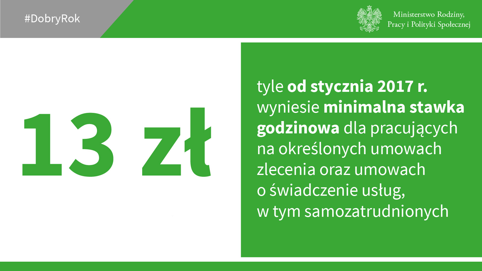 Ministerstwo Rodziny Pracy i Polityki Społecznej walczy z patologiami na rynku pracy. Od września umowa o pracę musi być podpisana z pracownikiem jeszcze przed dopuszczeniem go do pracy. To walka z tzw. syndromem pierwszej dniówki, kiedy to pracodawcy zwlekali z podpisaniem dokumentów. Od nowego roku zatrudnieni na określonych umowach zlecenia oraz umowach o świadczenie usług, w tym samozatrudnieni, będą objęci minimalną stawką godzinowa za pracę, która wyniesie 13 zł i będzie co roku waloryzowana. W 2017 r. wzrośnie też płaca minimalna – do 2000 tys. zł.
