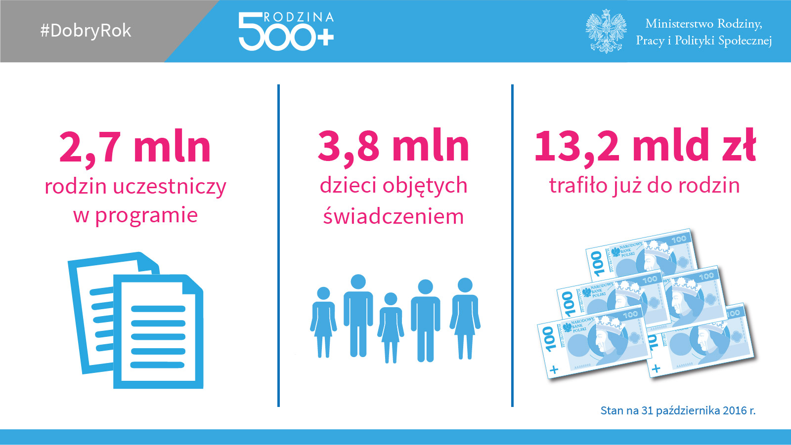 Jednym z pierwszych projektów realizowanych przez Ministerstwo Rodziny Pracy i Polityki Społecznej był program „Rodzina 500 plus”. Wszedł w życie 1 kwietnia tego roku. Świadczeniem 500 plus objętych jest ok. 2,7 mln rodzin, które otrzymują wsparcie na 3,8 mln dzieci. To 55% wszystkich dzieci w całym kraju. Na wsi ten wskaźnik jest jeszcze wyższy – wynosi 63%. Ok. 42% świadczeń wypłacanych jest na pierwsze lub jedyne dziecko – to ponad półtora miliona dzieci.