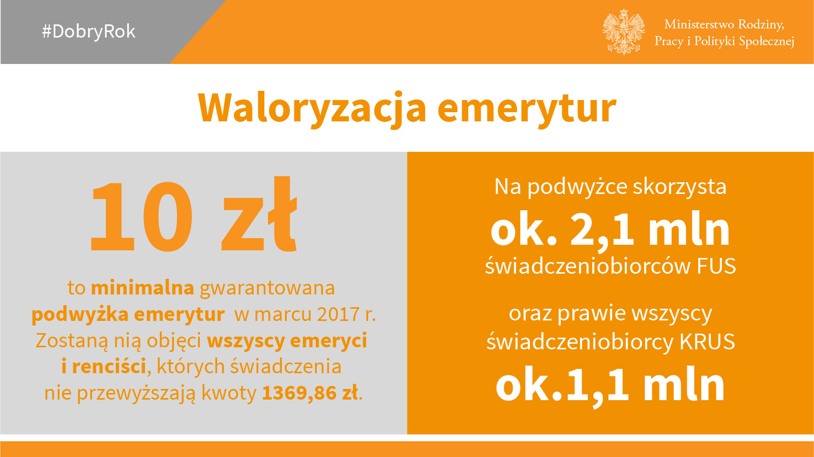Seniorzy stanowią w Polsce coraz liczniejsza grupę społeczną. Działania Ministerstwa Rodziny skupiają się wokół poprawy jakości życia osób starszych. Jedną z najważniejszych decyzji podjętych w ostatnim roku jest wzrost minimalnej emerytury do 1000 zł. Minimalna waloryzacja w przyszłym roku wyniesie co najmniej 10 zł. Zostaną nią objęci wszyscy emeryci i renciści, których świadczenia nie przewyższają kwoty 1369,86 zł. Na podwyżce skorzysta ok. 2,1 mln świadczeniobiorców FUS oraz prawie wszyscy świadczeniobiorcy KRUS (ok.1,1 mln).