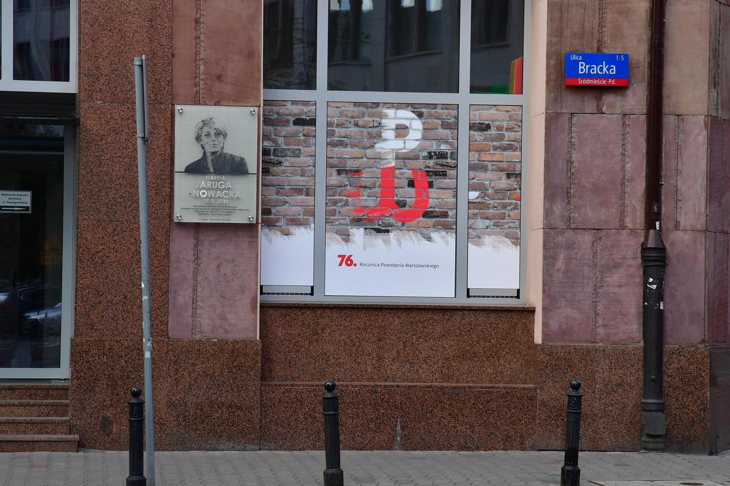 Ministerstwo Rodziny, Pracy i Polityki Społecznej upamiętniło rocznicę wybuchu Powstania Warszawskiego umieszczając na budynku resortu okolicznościowe ekspozycje graficzne. Jedna z nich przedstawia symbol Polski Walczącej, druga to kolaż zdjęć łączący obecną siedzibę MRPiPS i Ppor. Stanisława Sasinowskiego "Żbik" na barykadzie na ul. Brackiej.