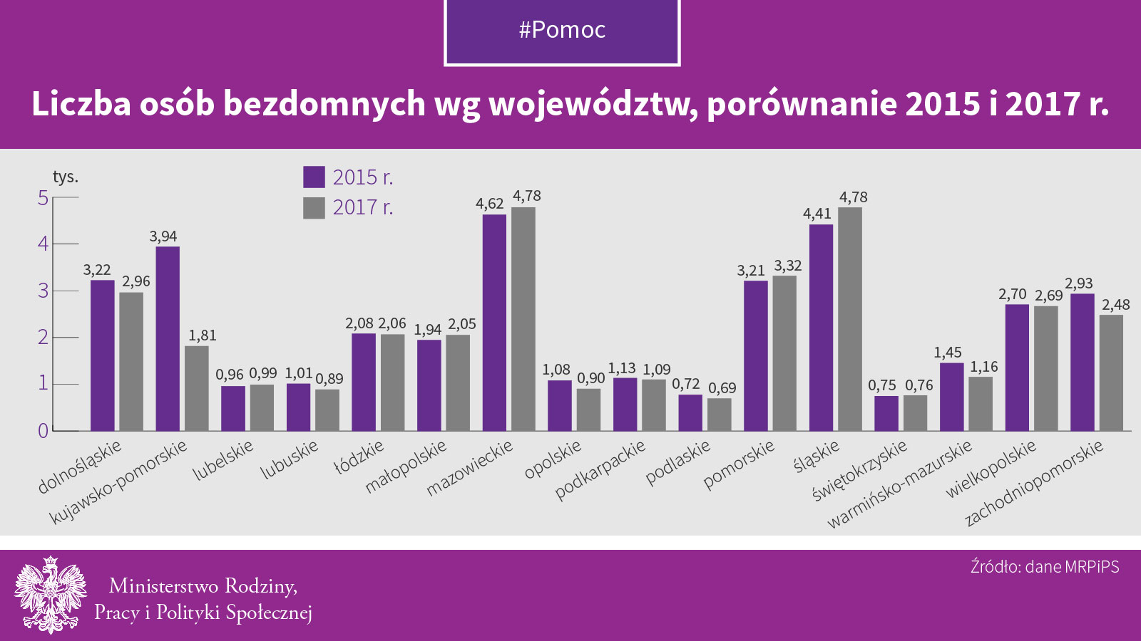 W porównaniu z rokiem 2015 liczba osób bezdomnych w województwach uległa zmianie. Wzrosła liczba osób bezdomnych m.in. w województwie śląskim o 367 osób, mazowieckim o 159 osób i małopolskim o 112 osób. Znacznie mniej osób zdiagnozowano w szczególności w województwach: kujawsko-pomorskim o 2 122 osoby i w zachodniopomorskim o 452 osoby. Liczba osób bezdomnych w pozostałych województwach plasowała się na zbliżonym poziomie jak w roku 2015.