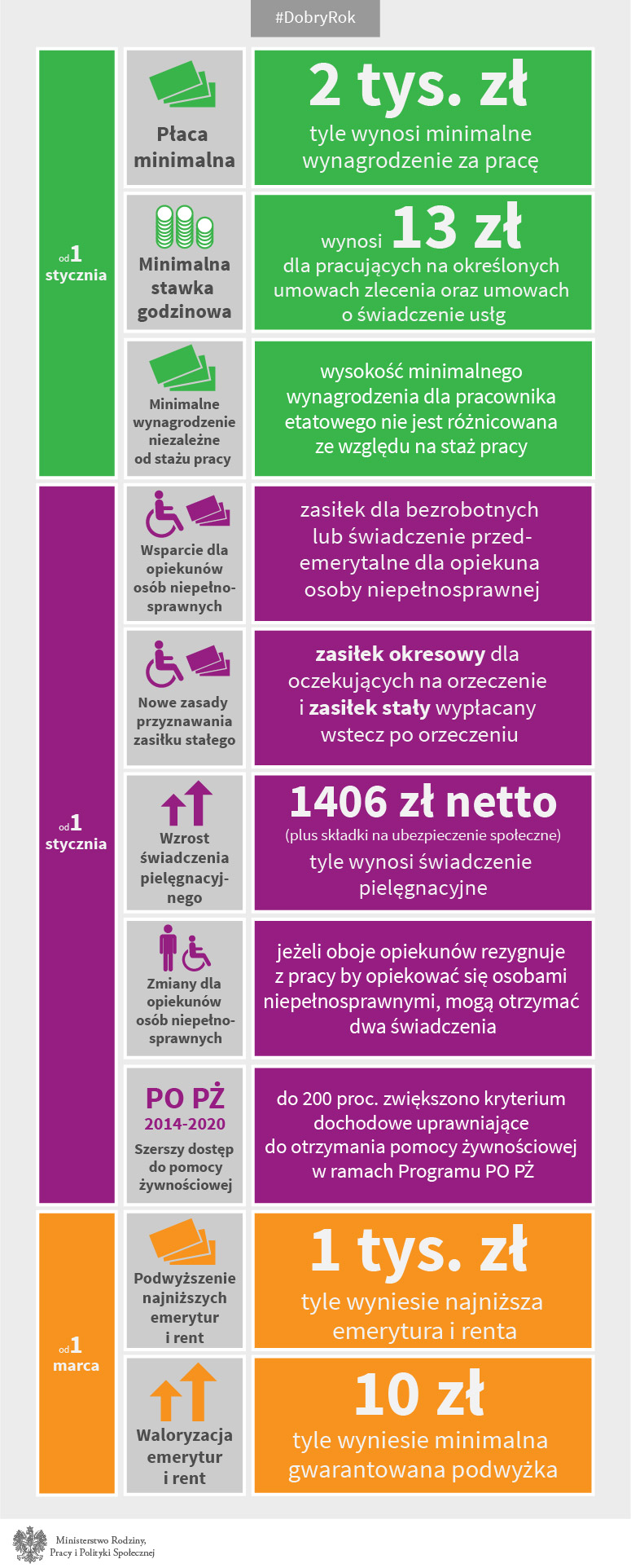 W 2017 wzrosła płaca minimalna i zaczęła obowiązywać minimalna stawka godzinowa. Zmieniają się niektóre zasady wsparcia osób niepełnosprawnych i ich opiekunów. Rozszerzono również dostęp do pomocy żywnościowej. Podwyższona zostanie emerytura i renta. Przedstawiamy najważniejsze zmiany.