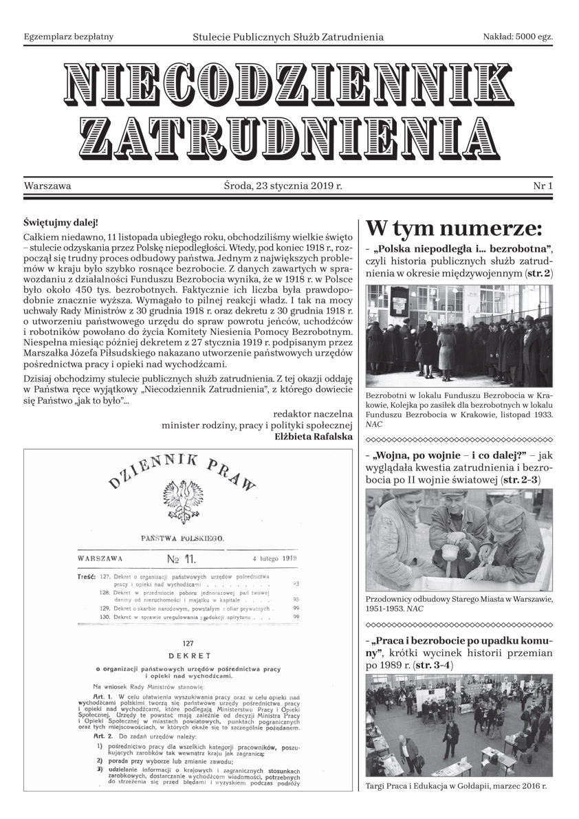 Z tej okazji oddajemy w Państwa ręce wyjątkową publikację – Niecodziennik Zatrudnienia. Znalazły się w nim archiwalne materiały pokazujące, jak kształtował się przez 100 lat rynek pracy, jakie wyzwania przed nim stały, ale też jak sytuacja kształtuje się dzisiaj. Zapraszamy do lektury!